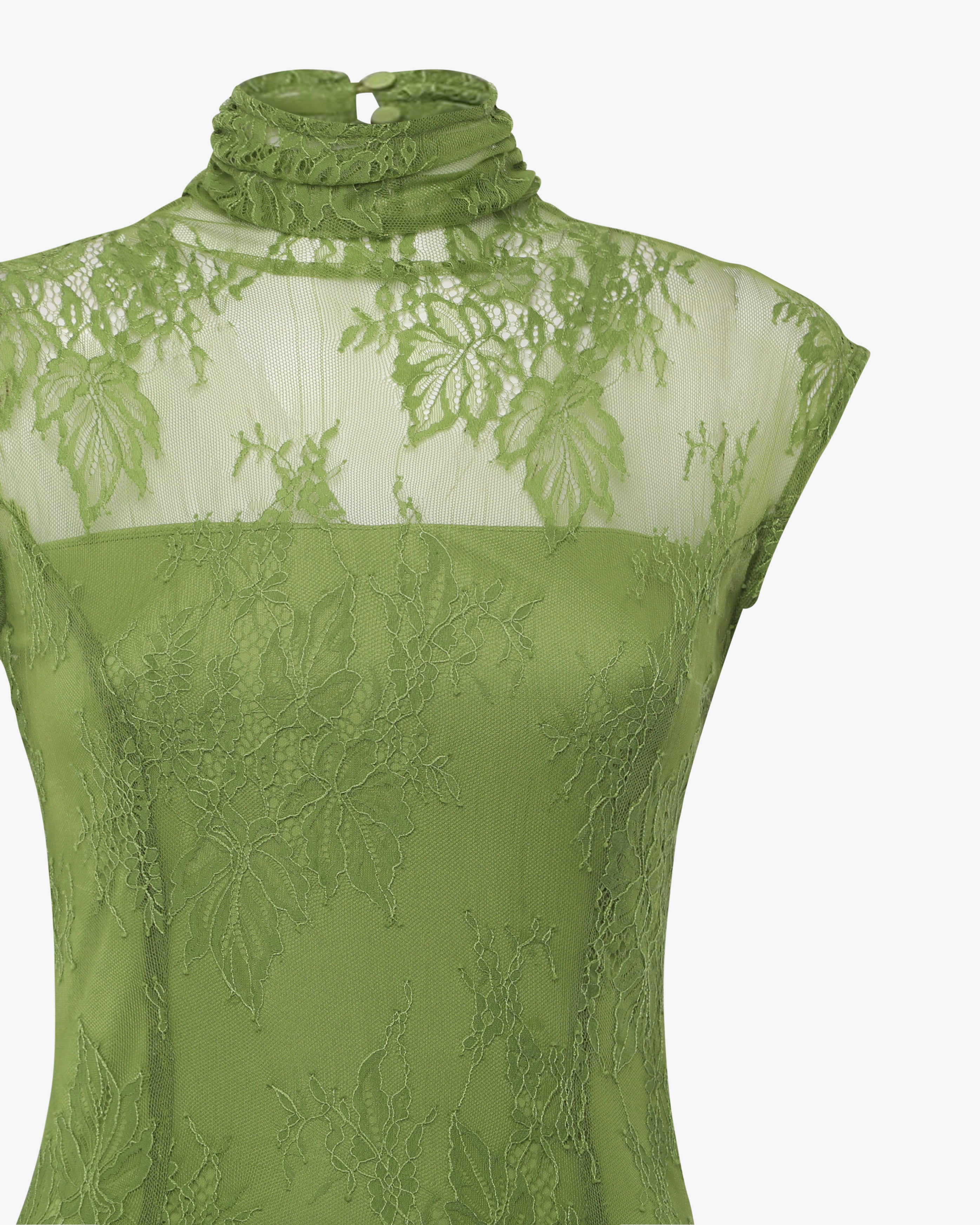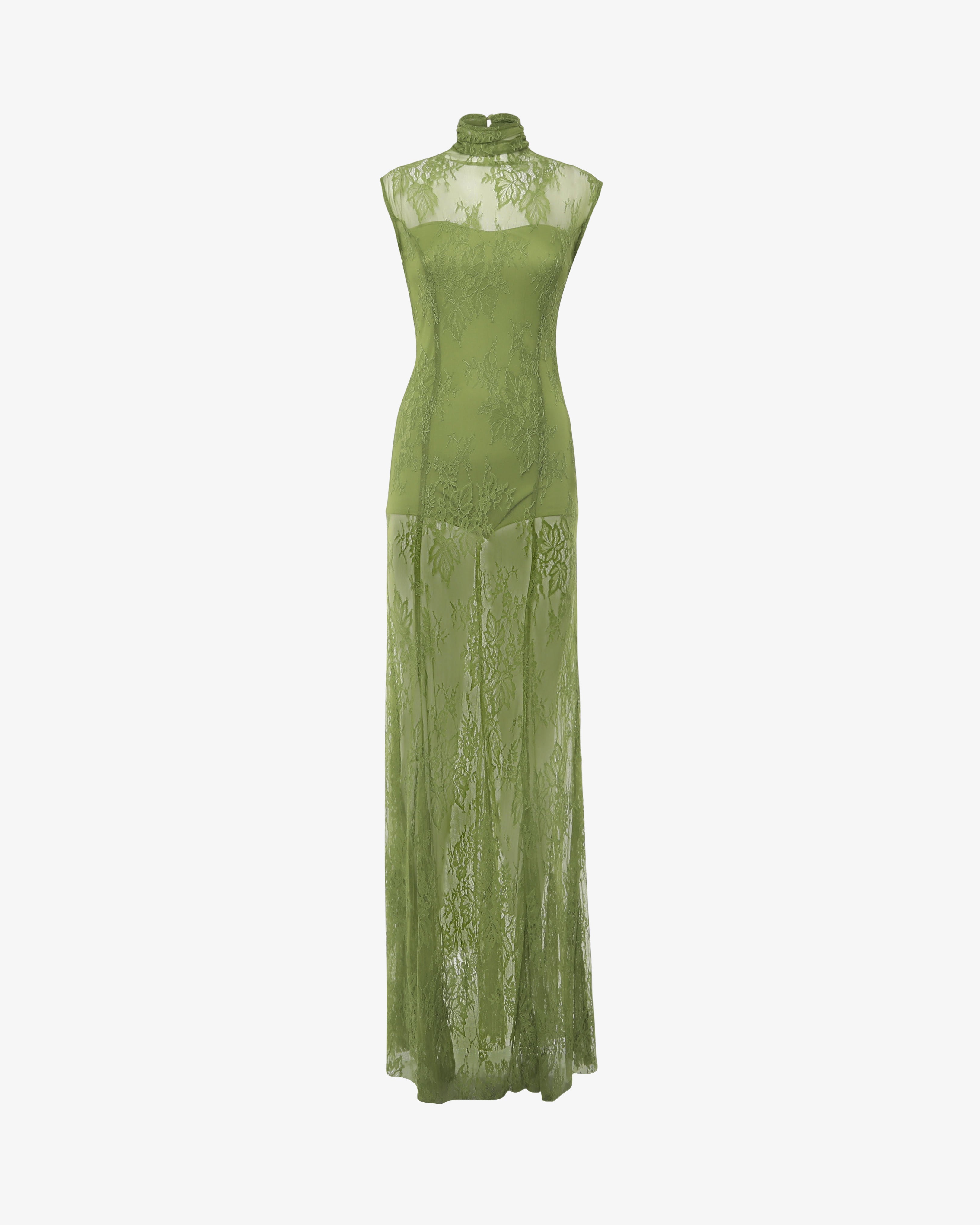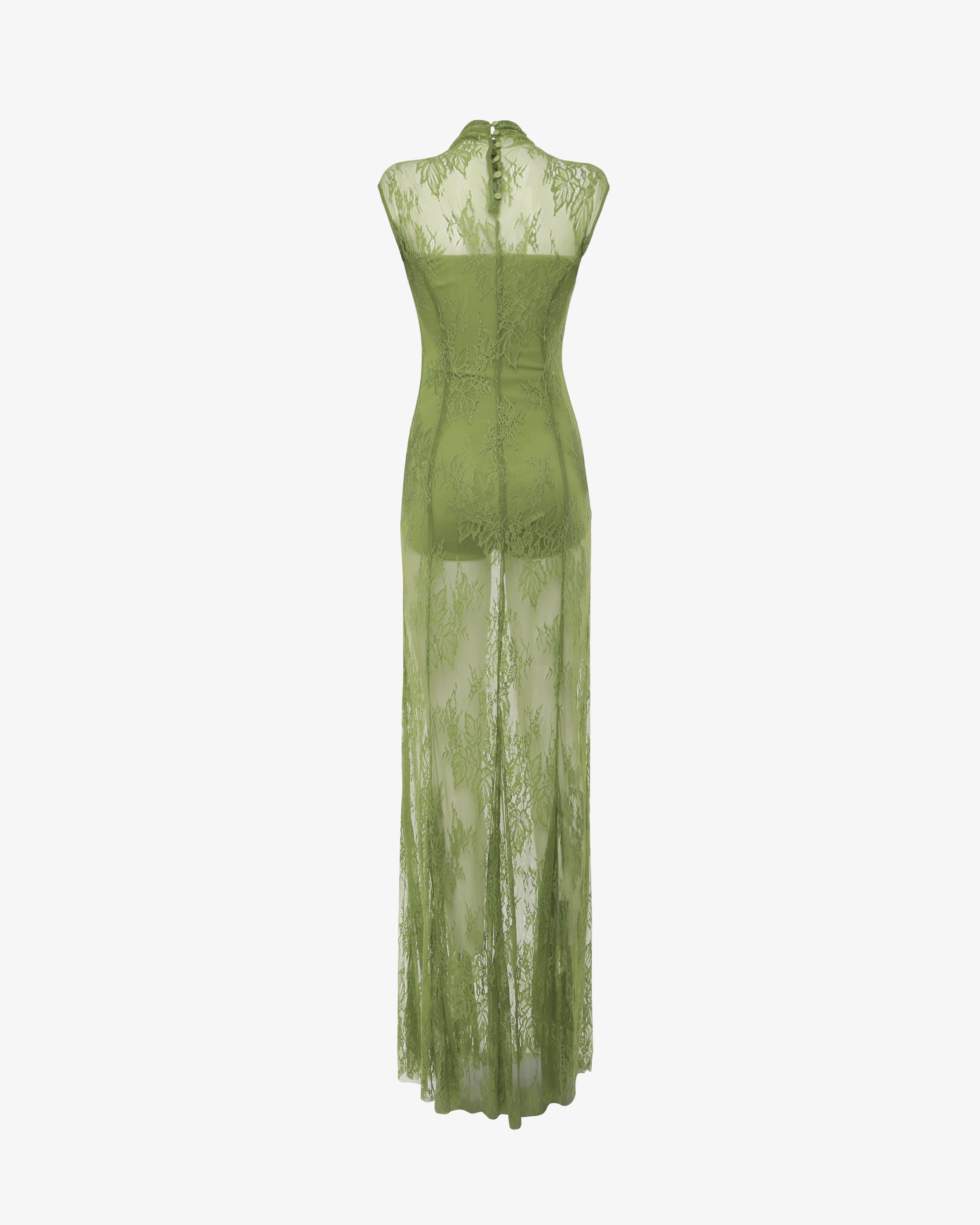 Abito lungo in pizzo con collo alto, ideale per un look elegante e sofisticato. Il design raffinato e la trasparenza delicata del pizzo valorizzano la silhouette con classe, mentre il collo alto aggiunge un tocco di romanticismo. Perfetto per cerimonie, serate speciali o eventi formali.