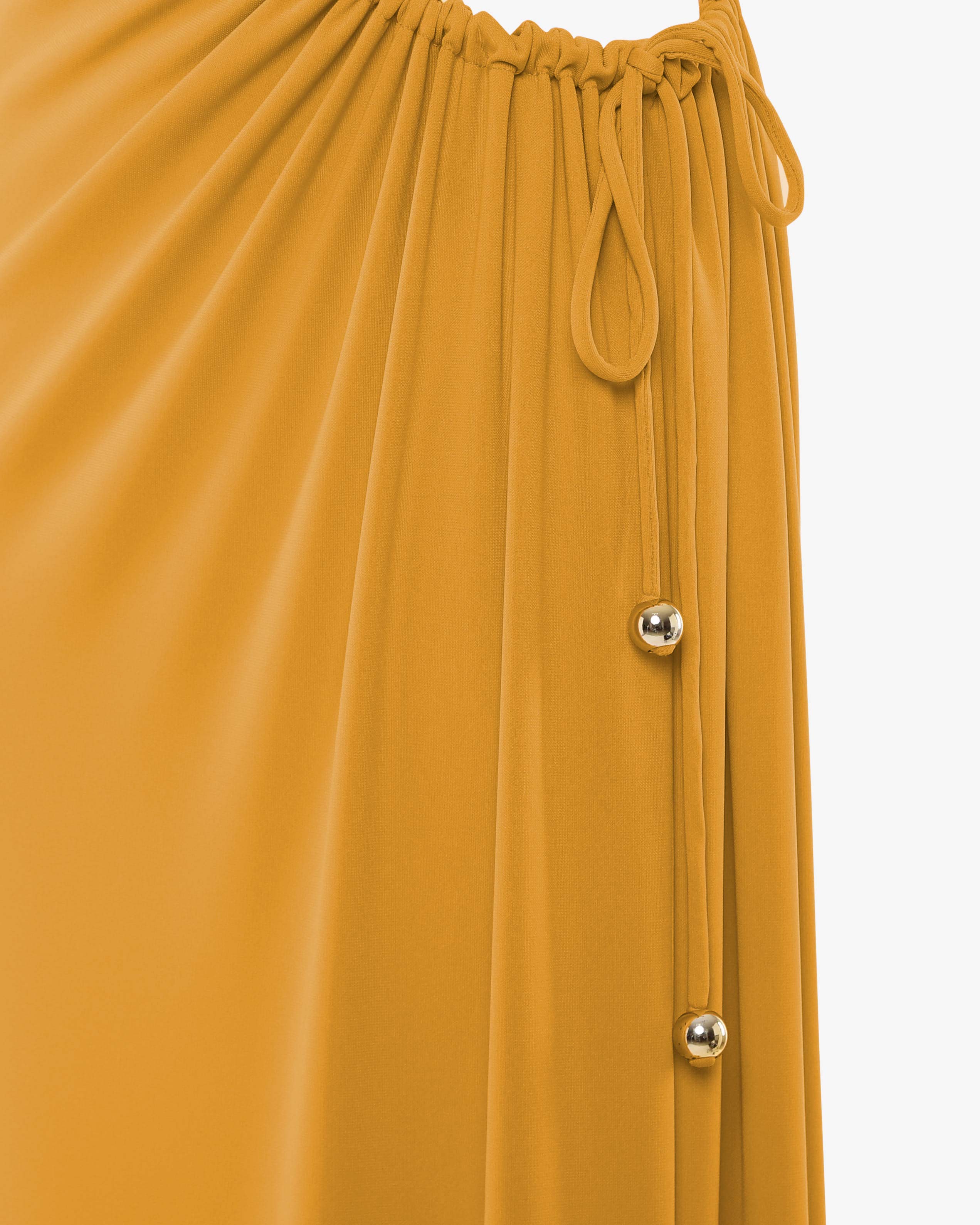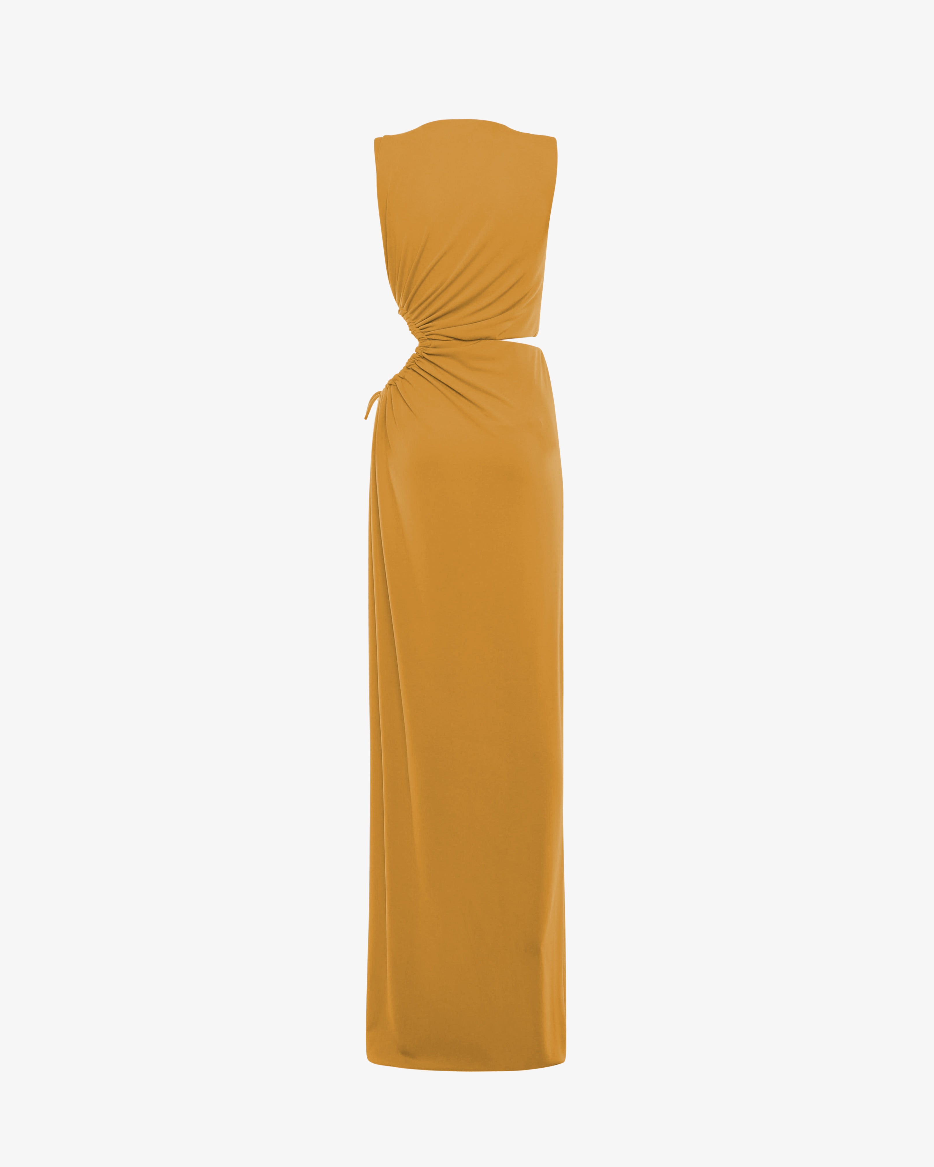Abito lungo in jersey con dettagli cut-out strategici, perfetto per un look audace e moderno. Il tessuto elasticizzato valorizza la silhouette, mentre i tagli sul corpo aggiungono un tocco sensuale. Ideale per serate, eventi speciali o party dal mood glamour.