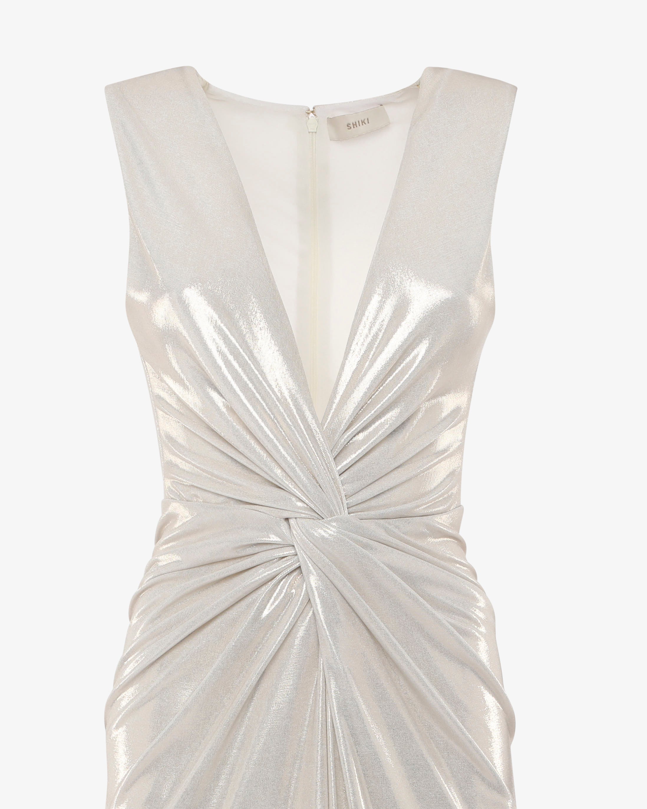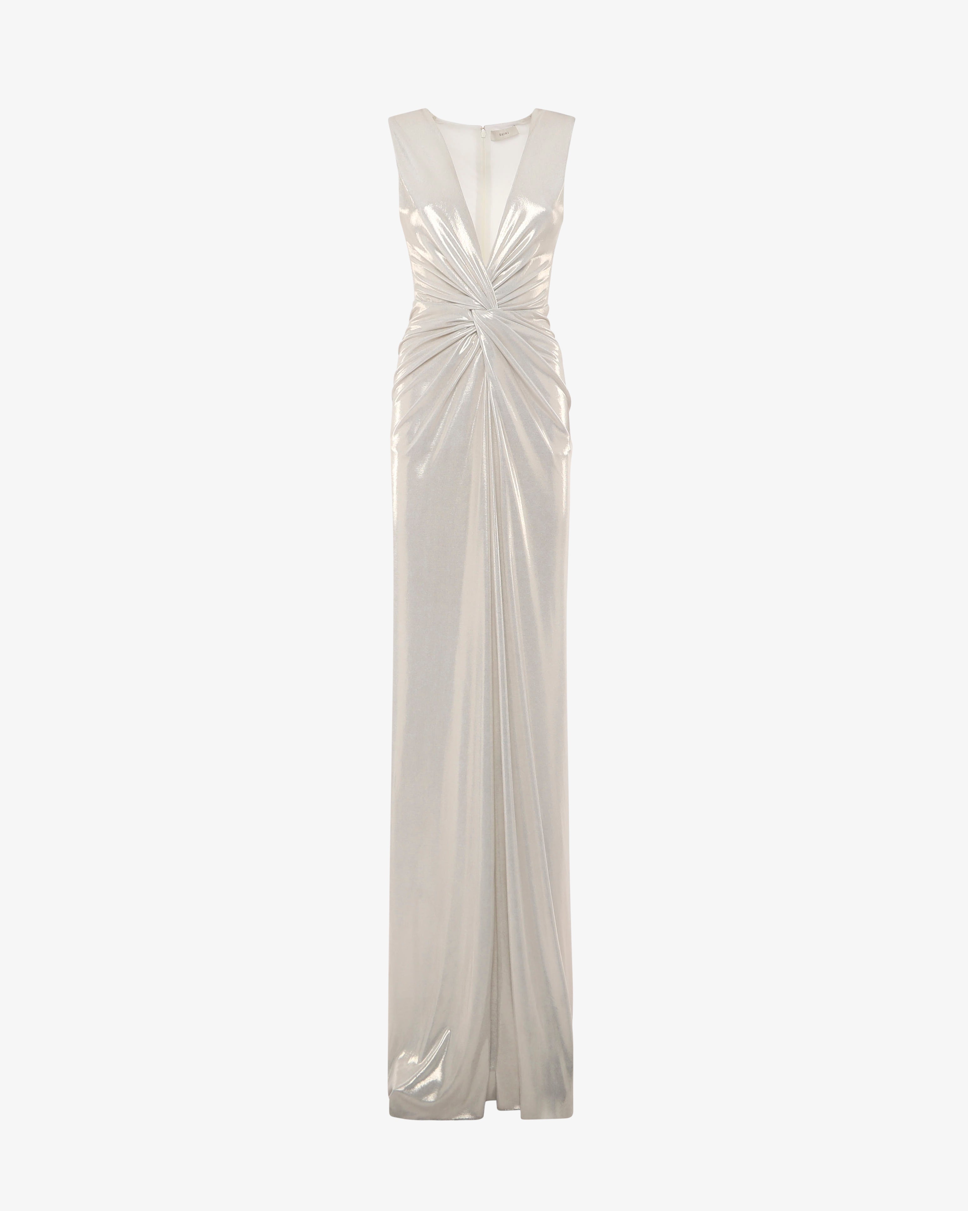 Abito lungo in jersey metallizzato con profondo scollo a V, perfetto per un look audace e sofisticato. Il tessuto brillante valorizza la silhouette con eleganza, mentre il taglio aderente e il décolleté profondo aggiungono un tocco sensuale. Ideale per eventi serali, cerimonie o occasioni speciali in cui vuoi brillare.