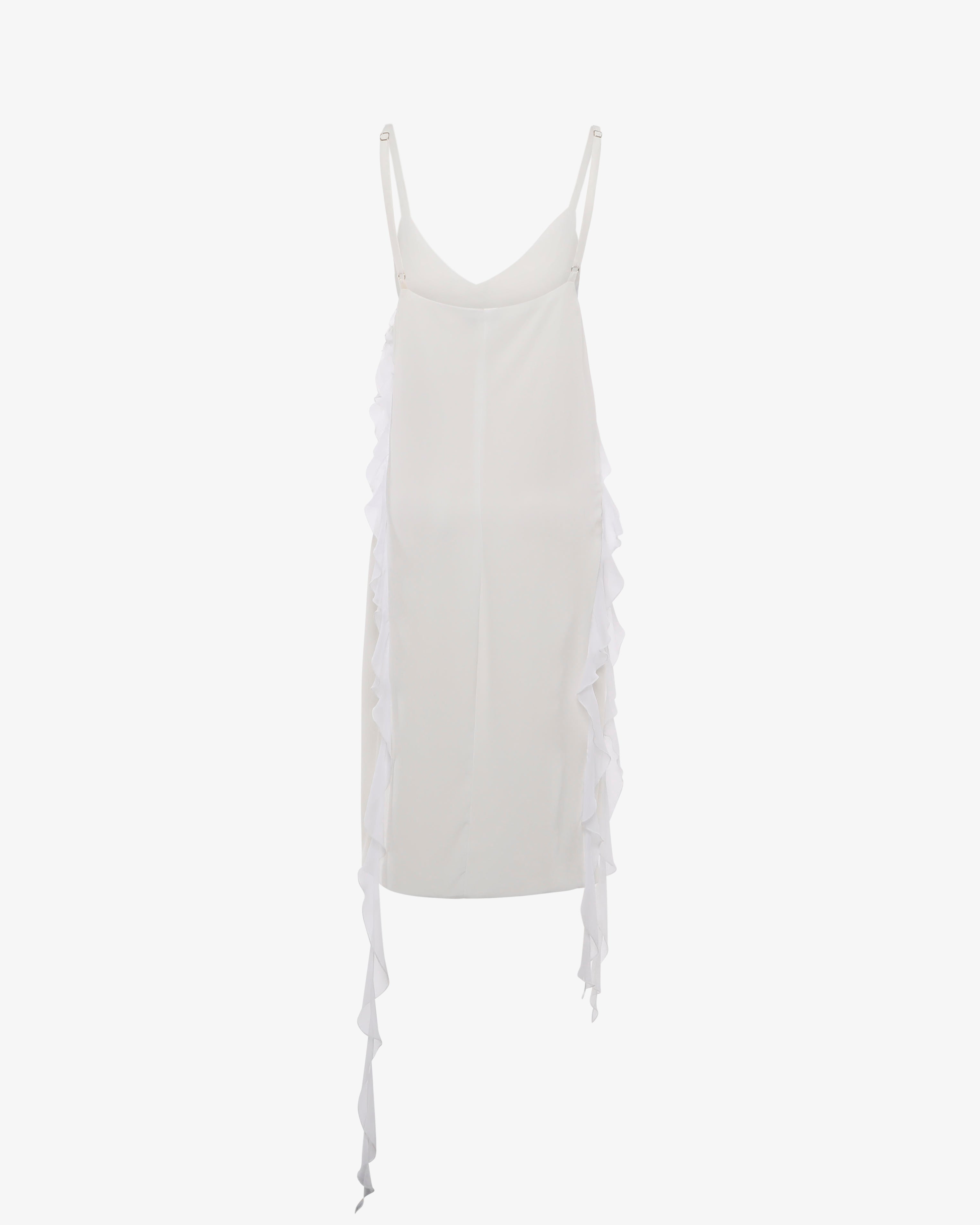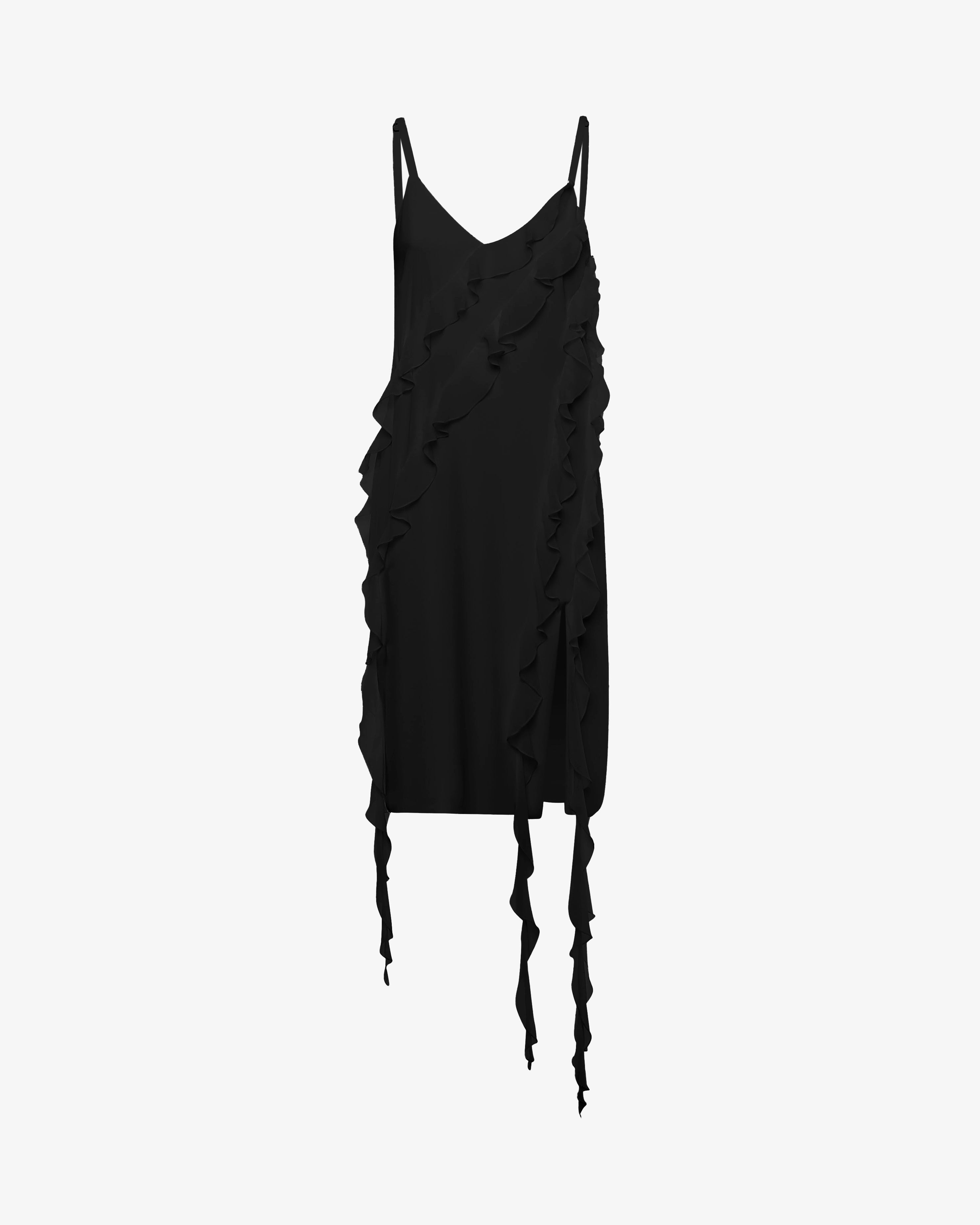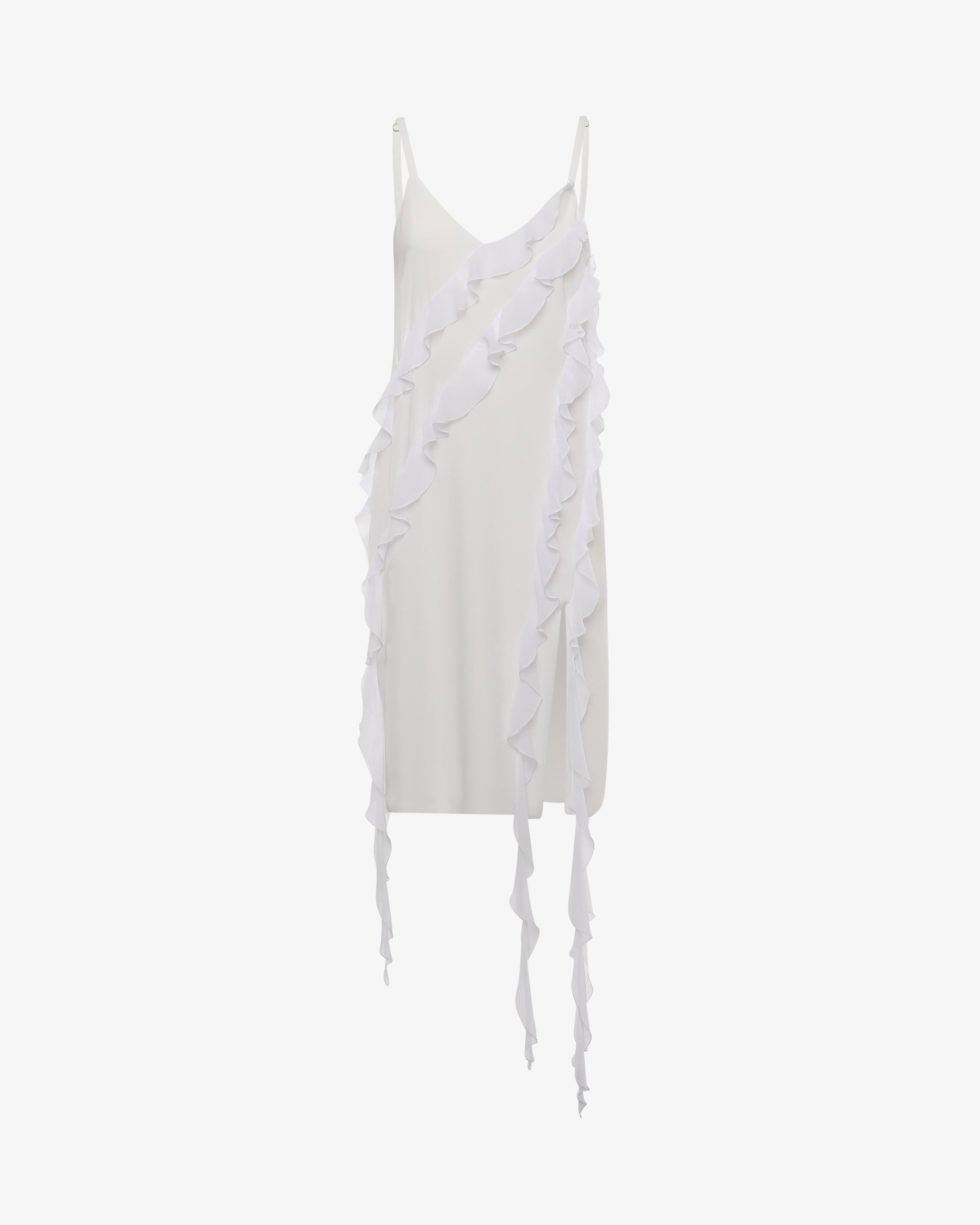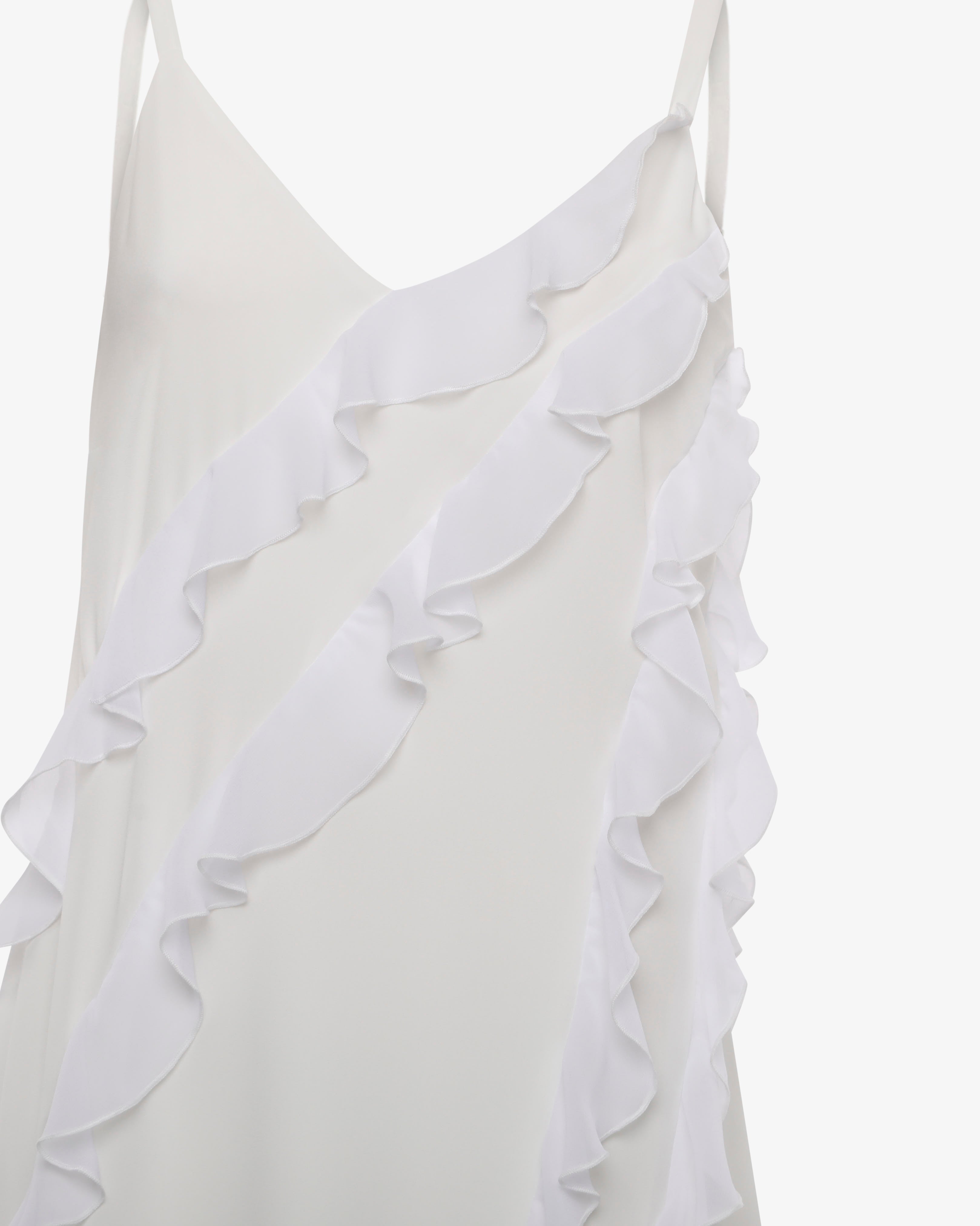 Abito mini in georgette con spalline sottili e volant, perfetto per un look fresco e romantico. Il tessuto leggero dona movimento e leggerezza, mentre i dettagli svolazzanti aggiungono un tocco femminile. Ideale per la stagione estiva, aperitivi, party o occasioni speciali.