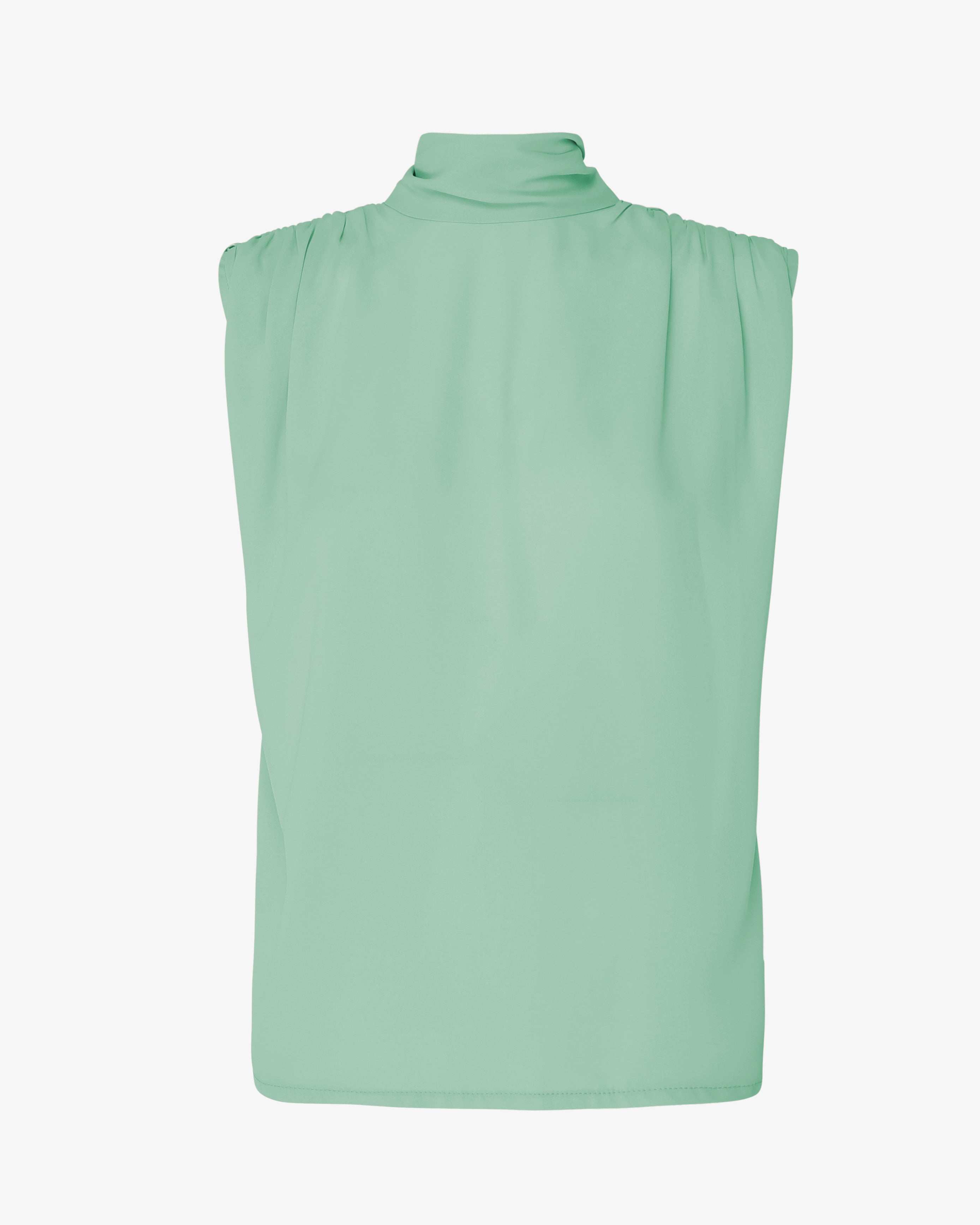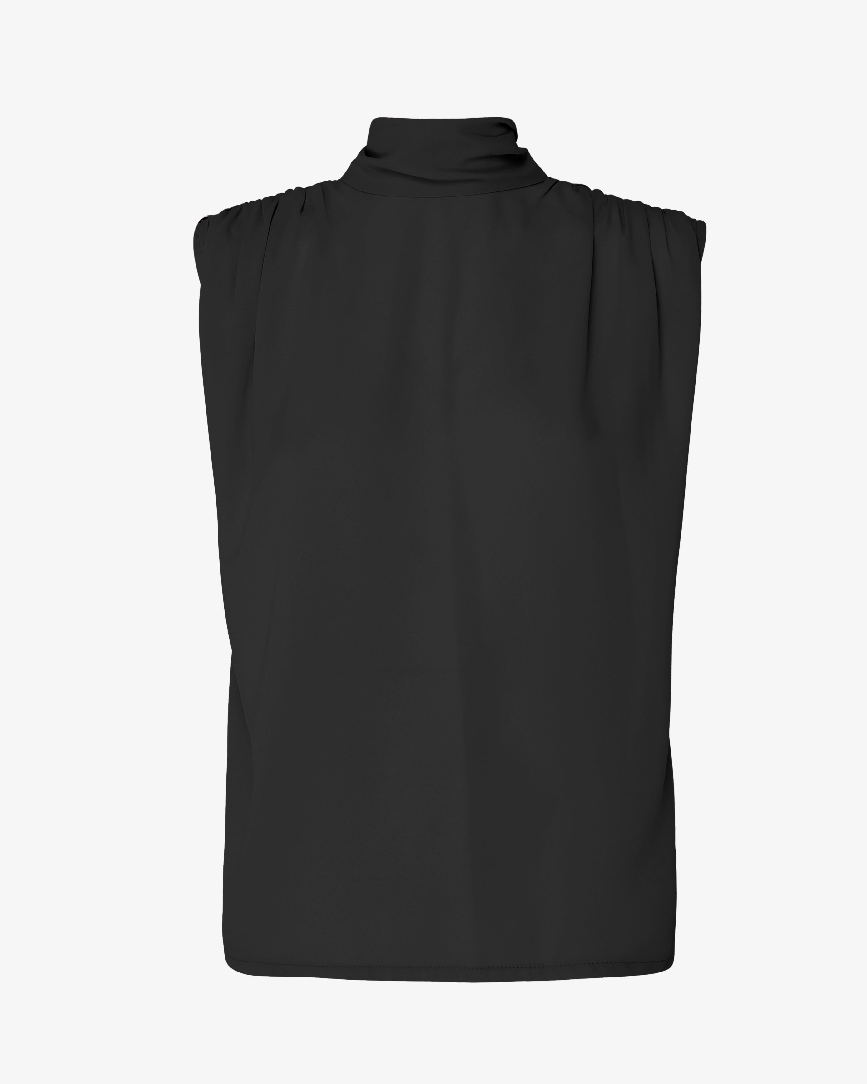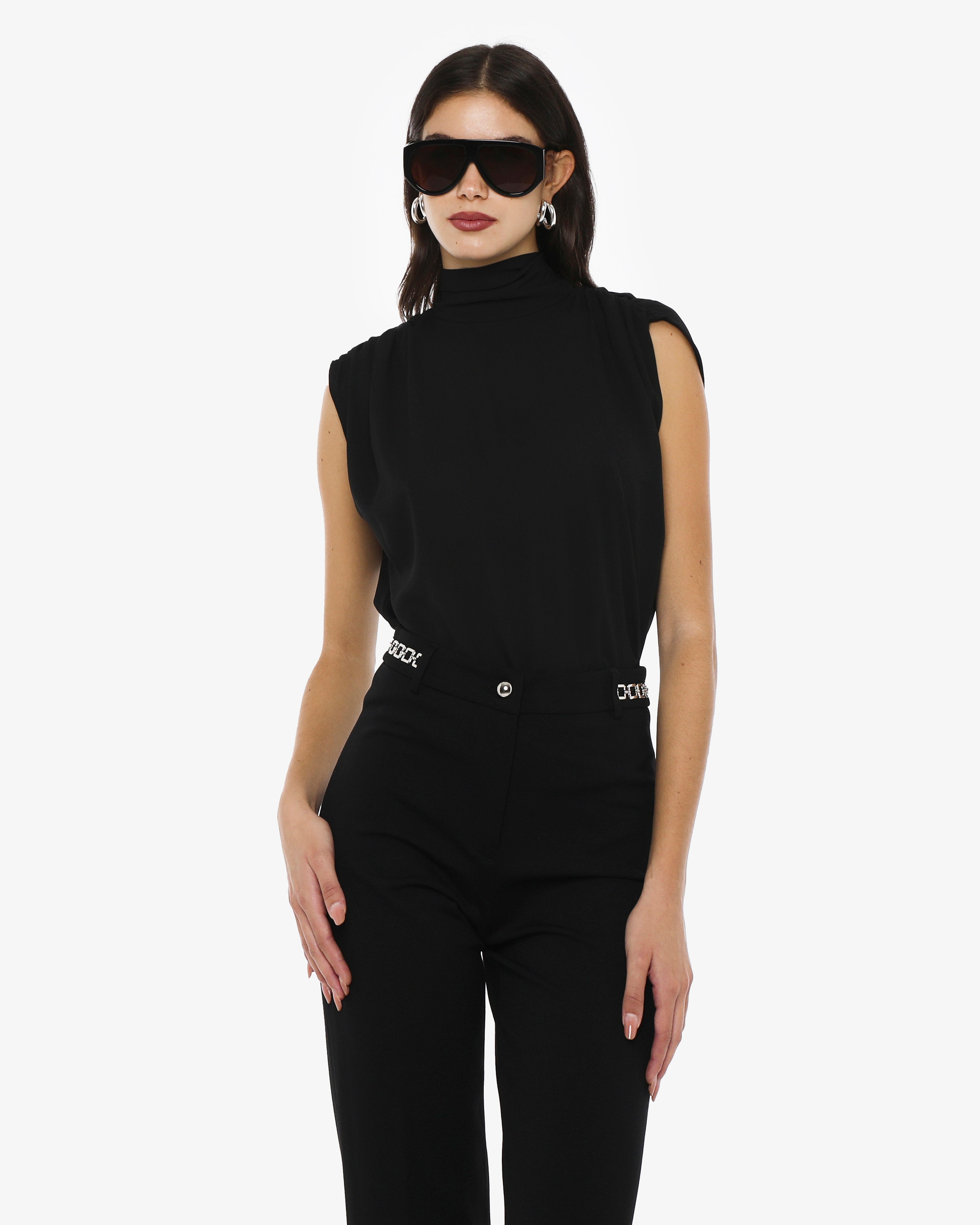 Blusa a collo alto senza maniche in georgette, un capo elegante e versatile perfetto per ogni occasione. Realizzata in tessuto leggero e fluido, offre una vestibilità morbida che accarezza la silhouette con raffinatezza. Il collo alto aggiunge un tocco di classe, creando una linea slanciata e sofisticata. L’assenza di maniche rende la blusa ideale per look stratificati o per essere indossata da sola durante la stagione calda.