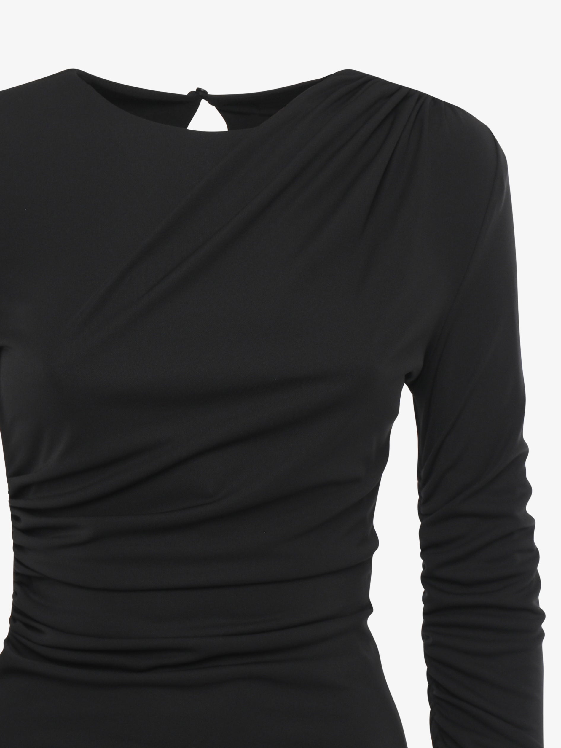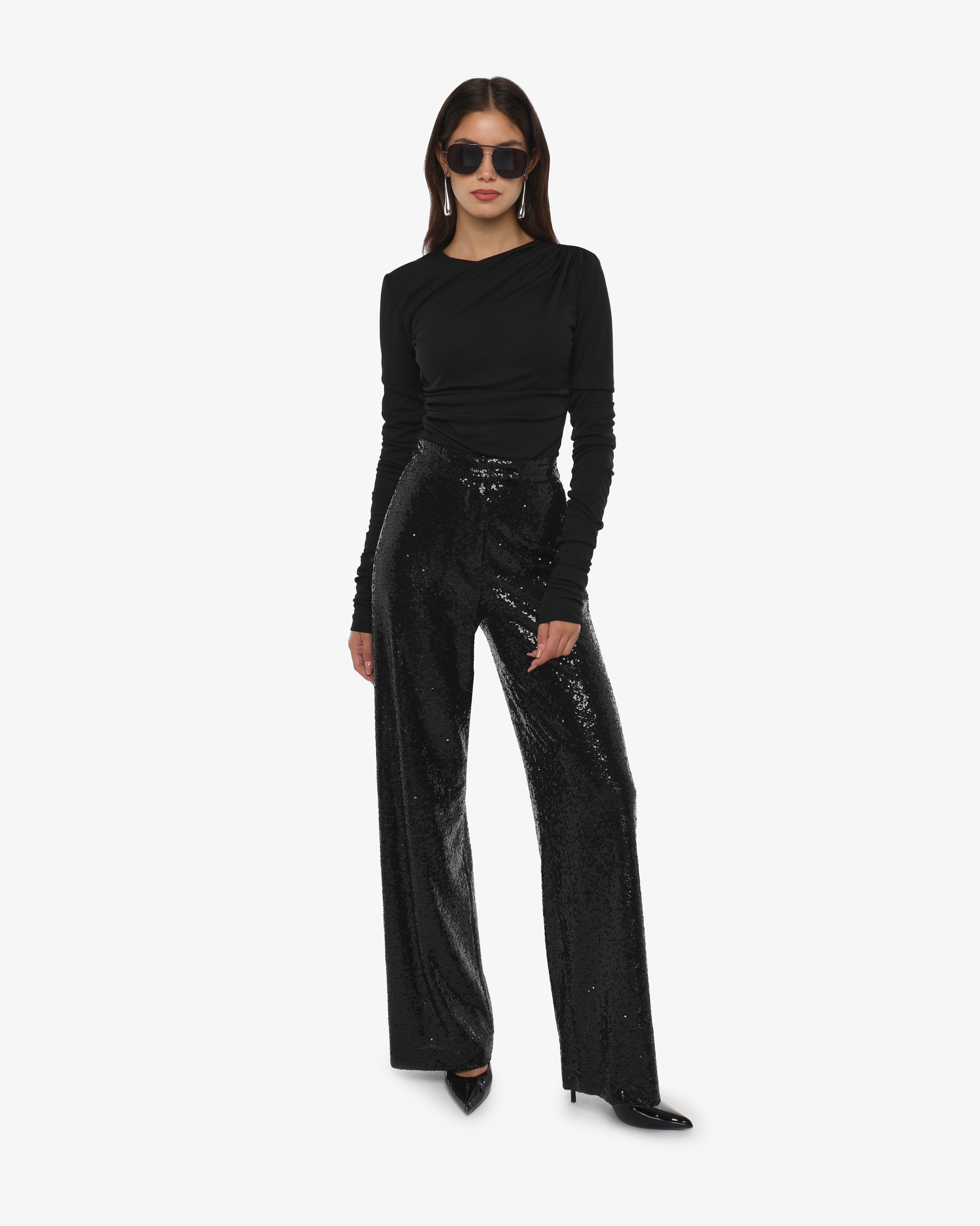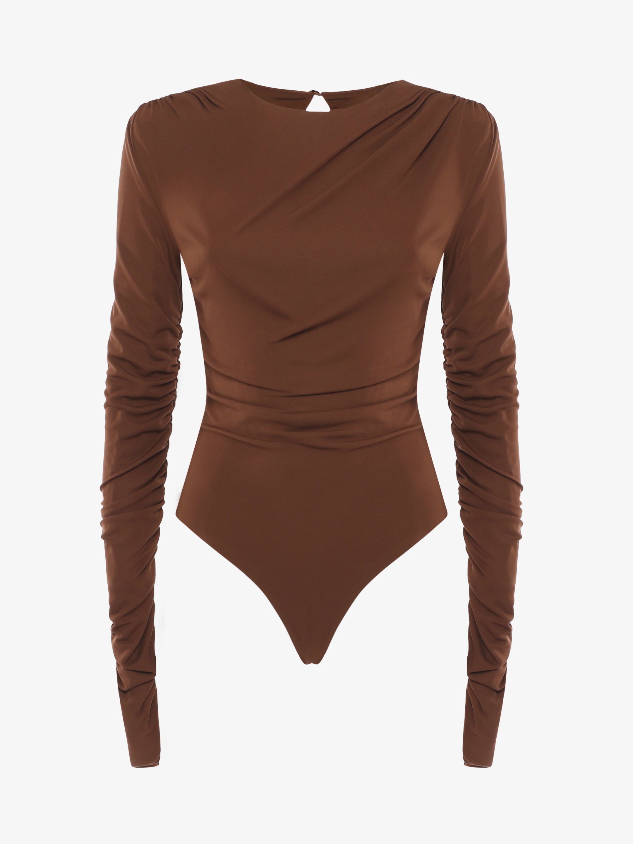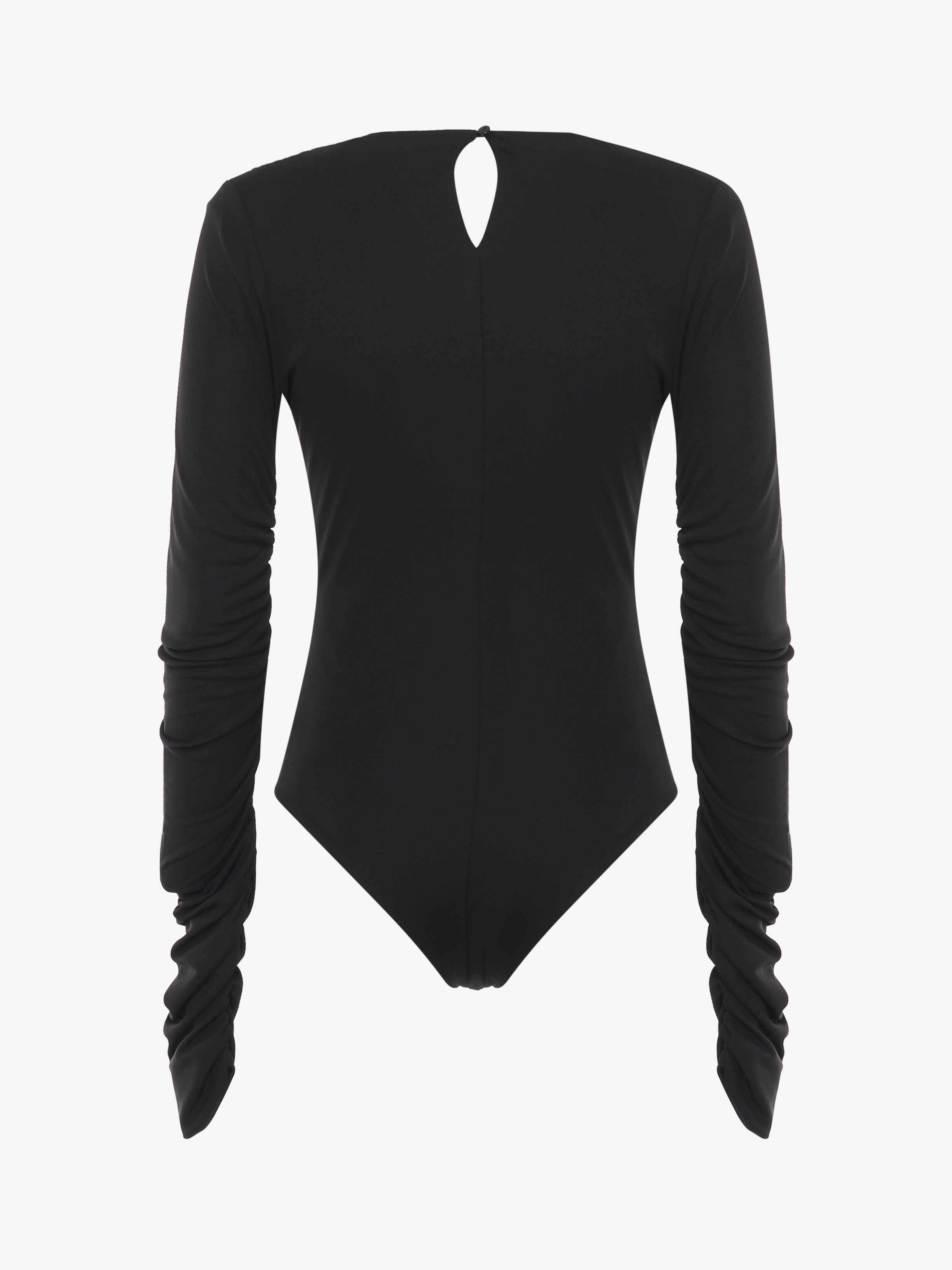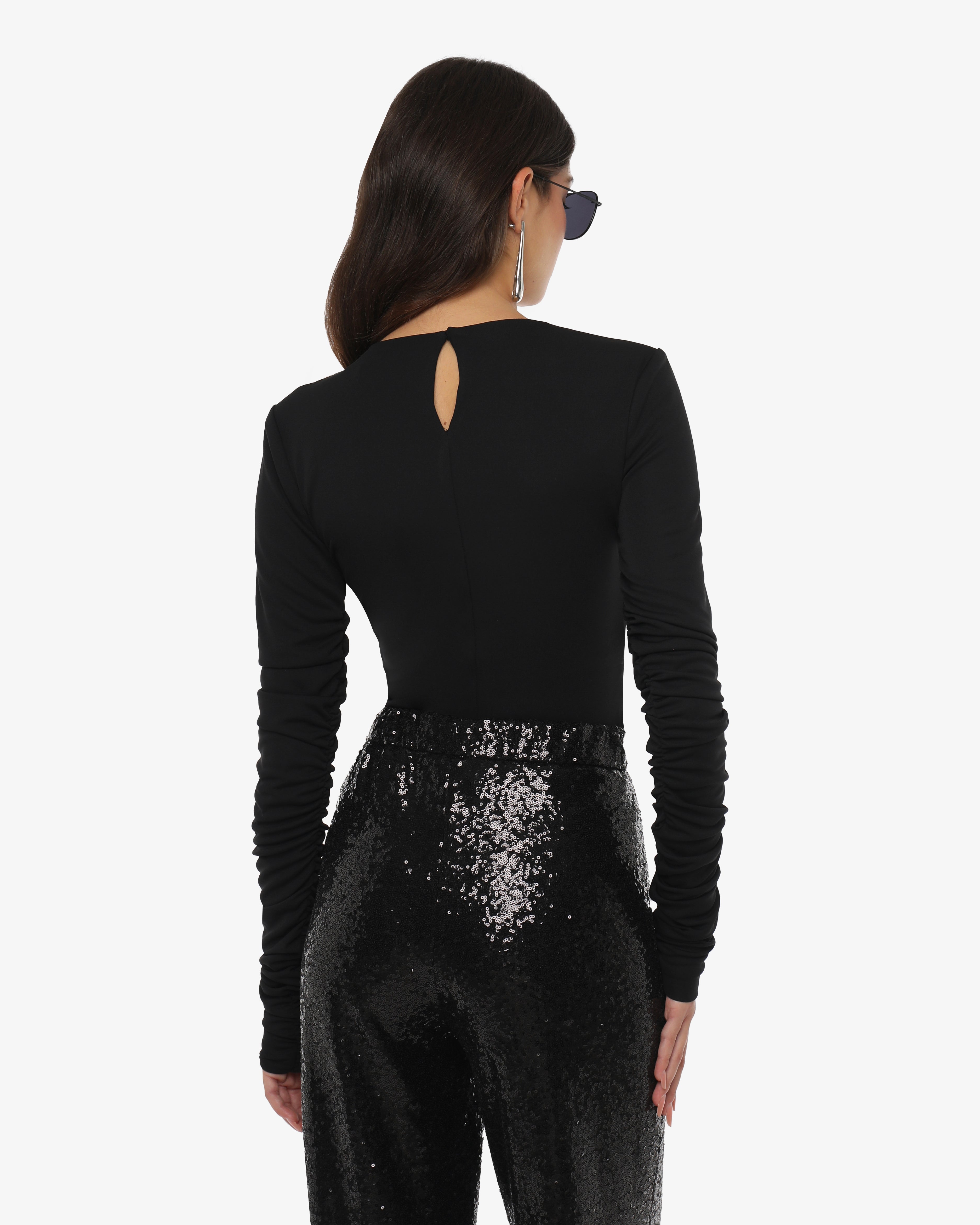 Body accollato a maniche lunghe in jersey con spalline strutturate, perfetto per un look moderno e sofisticato. Realizzato in tessuto elasticizzato che avvolge la silhouette, offre comfort e una vestibilità aderente. Il design accollato aggiunge un tocco elegante, mentre le spalline definite creano una linea strutturata e decisa. Ideale per outfit da sera o look business-chic, si abbina facilmente a pantaloni a vita alta, gonne a matita o jeans per uno stile versatile e sempre impeccabile.