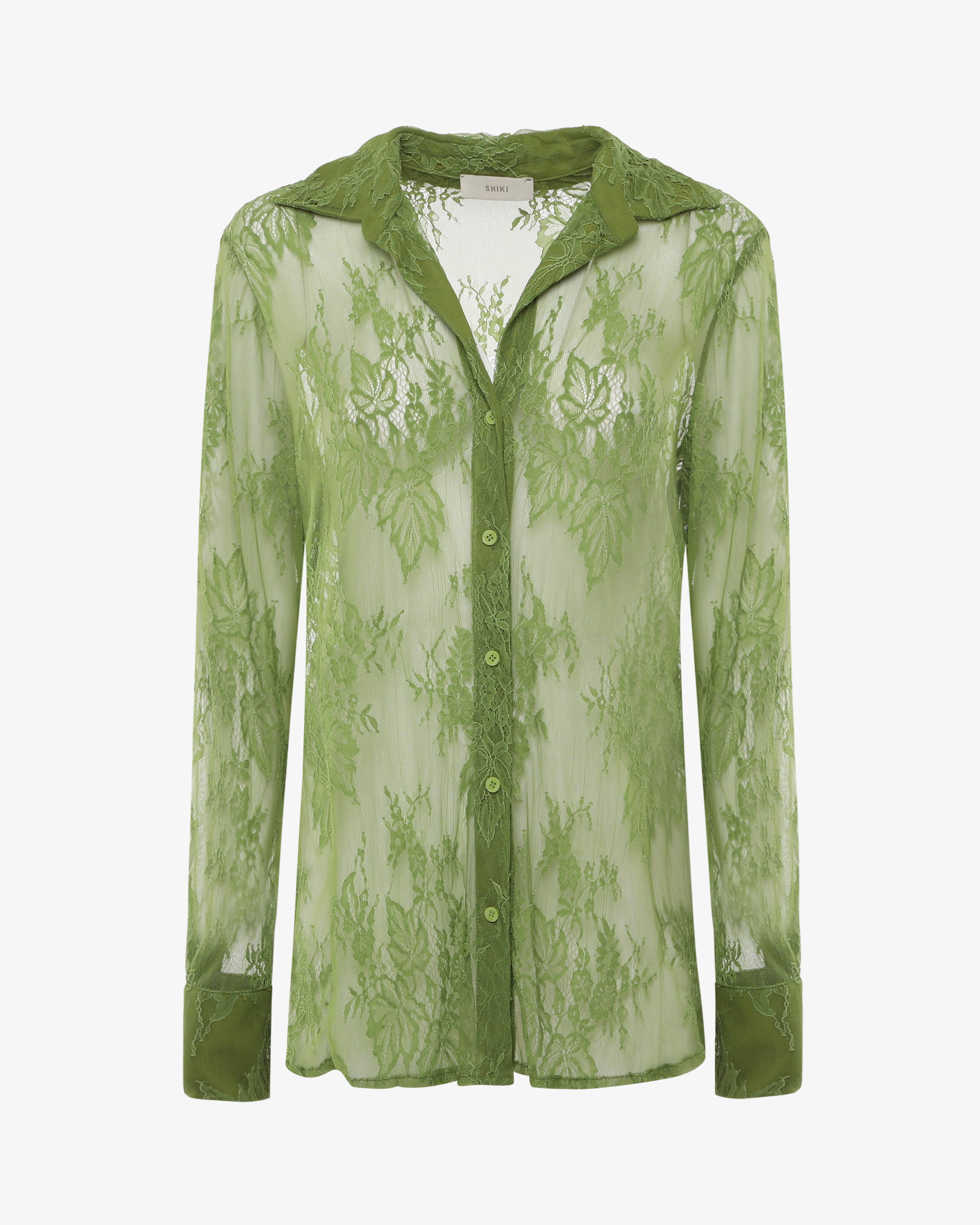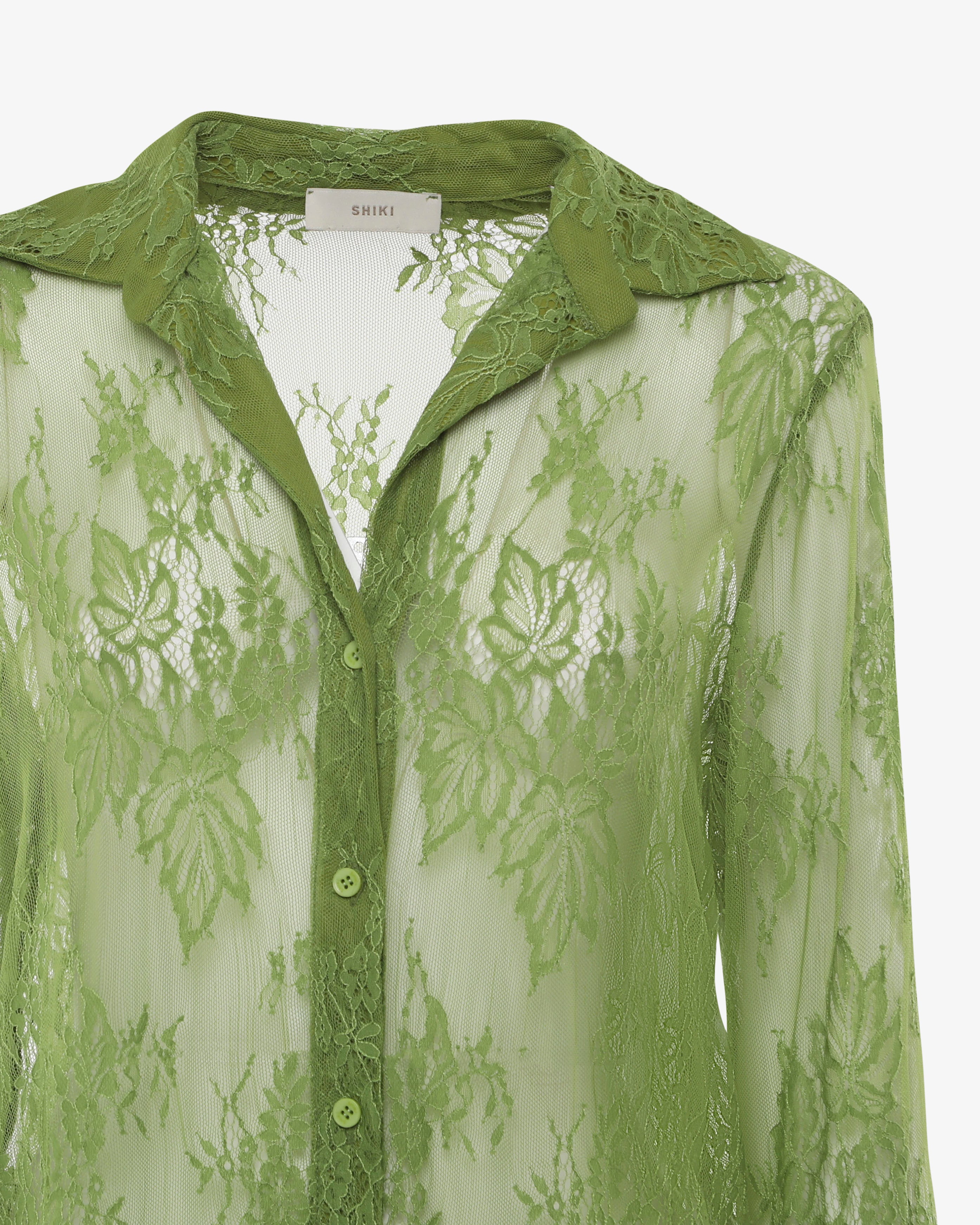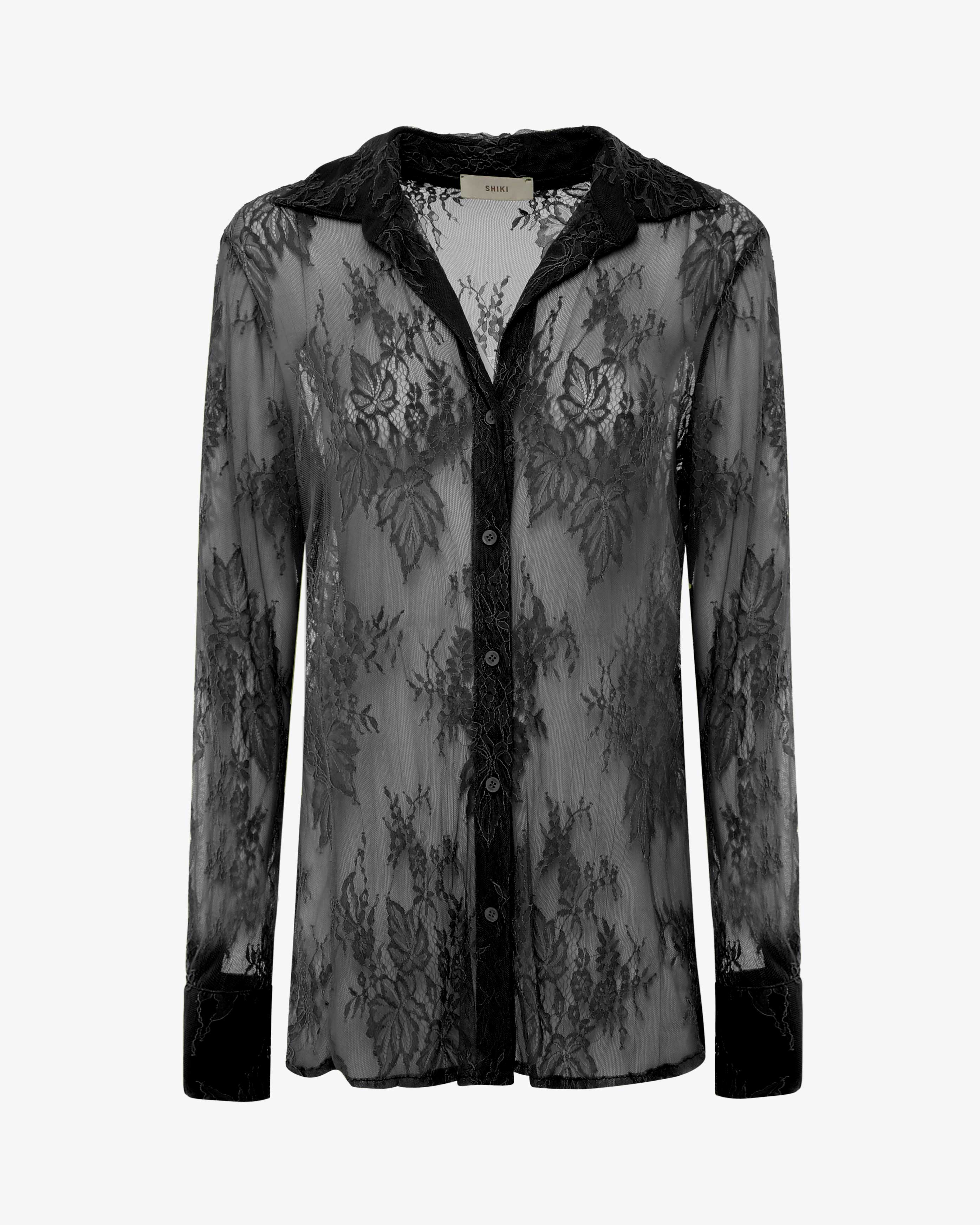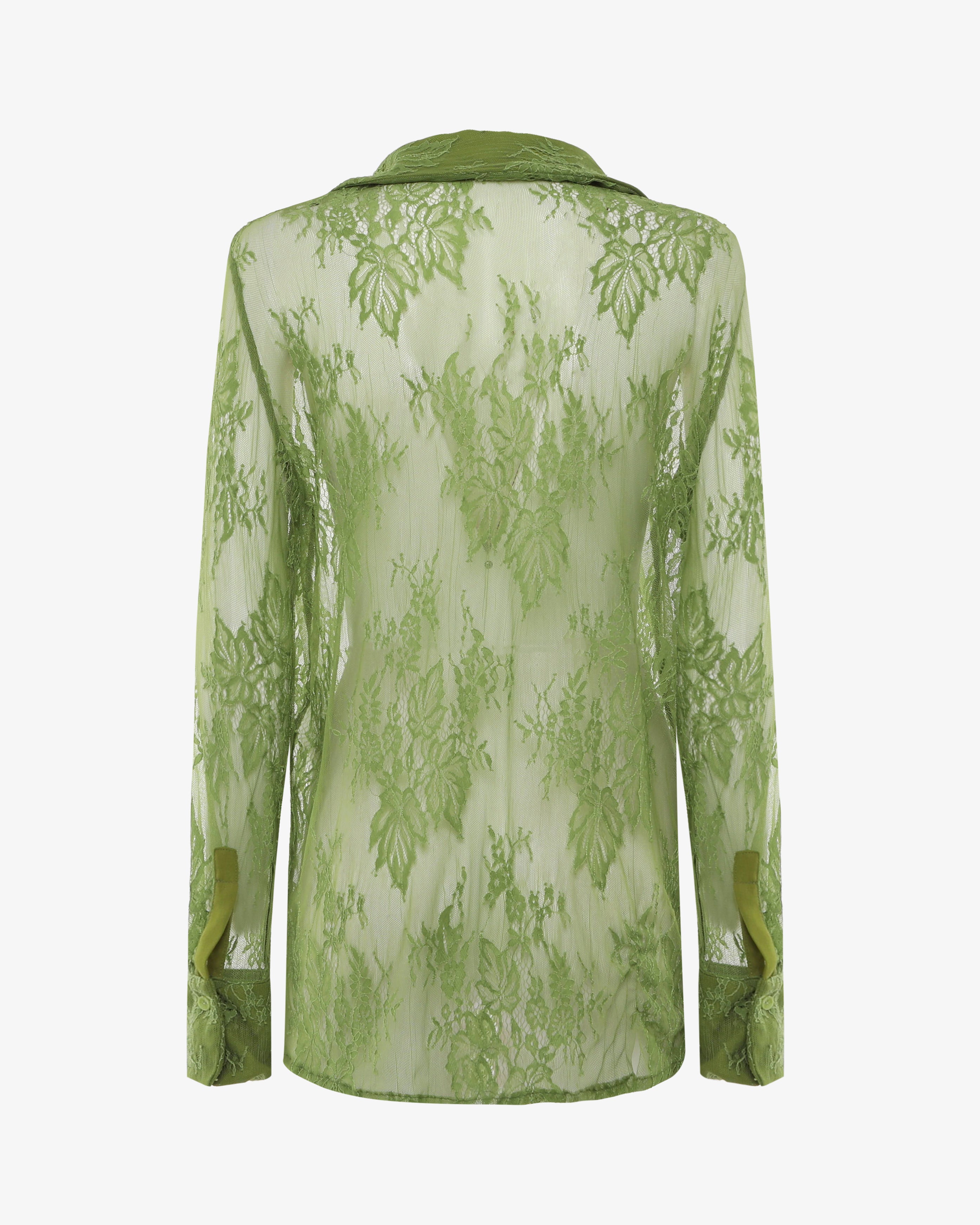 Camicia elegante a maniche lunghe in pizzo, perfetta per aggiungere un tocco romantico e sofisticato al tuo look. Trasparenze delicate, dettagli raffinati e vestibilità femminile. Ideale per cerimonie o serate speciali.