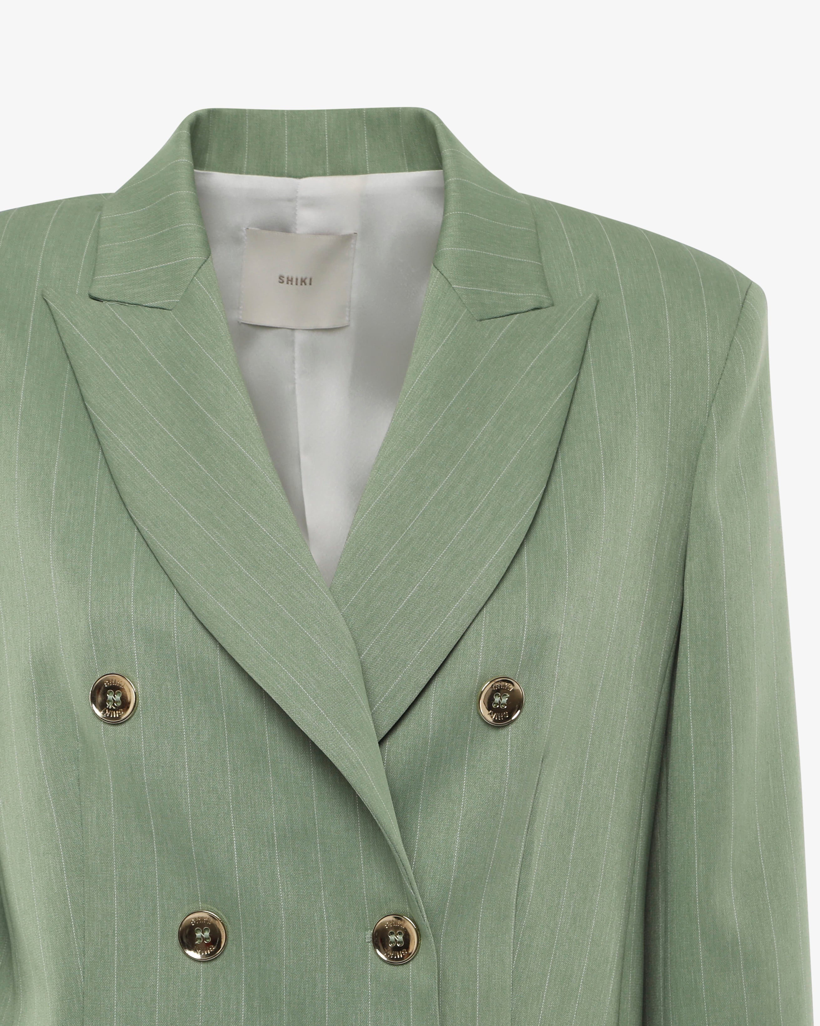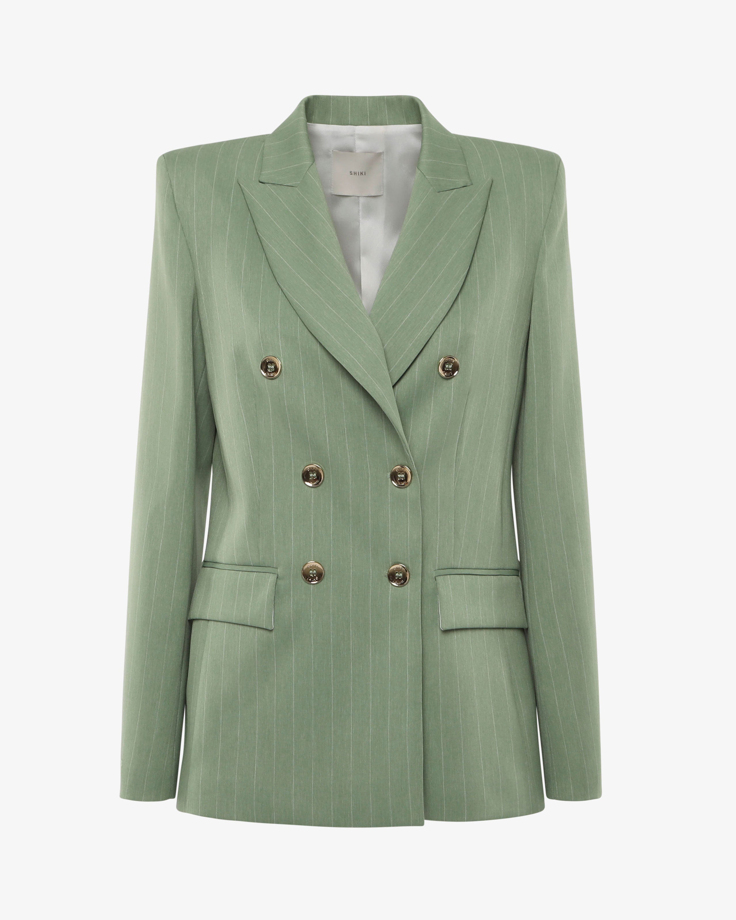 Giacca doppiopetto gessata con bottoni dorati, dal design elegante e deciso. Il taglio sartoriale e le righe verticali slanciano la figura, mentre i bottoni oro aggiungono un tocco sofisticato. Perfetta per look formali, da ufficio o per occasioni speciali con stile.