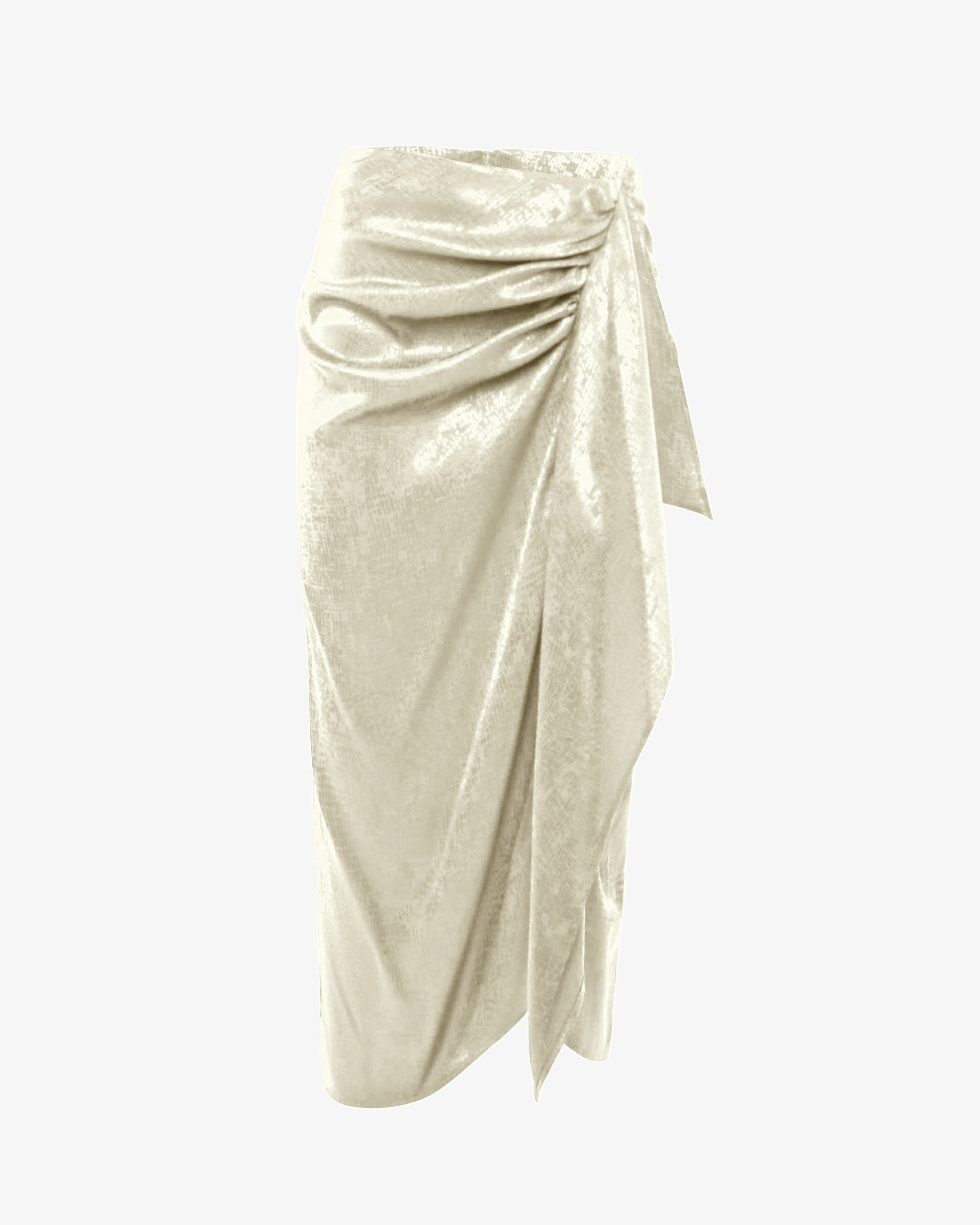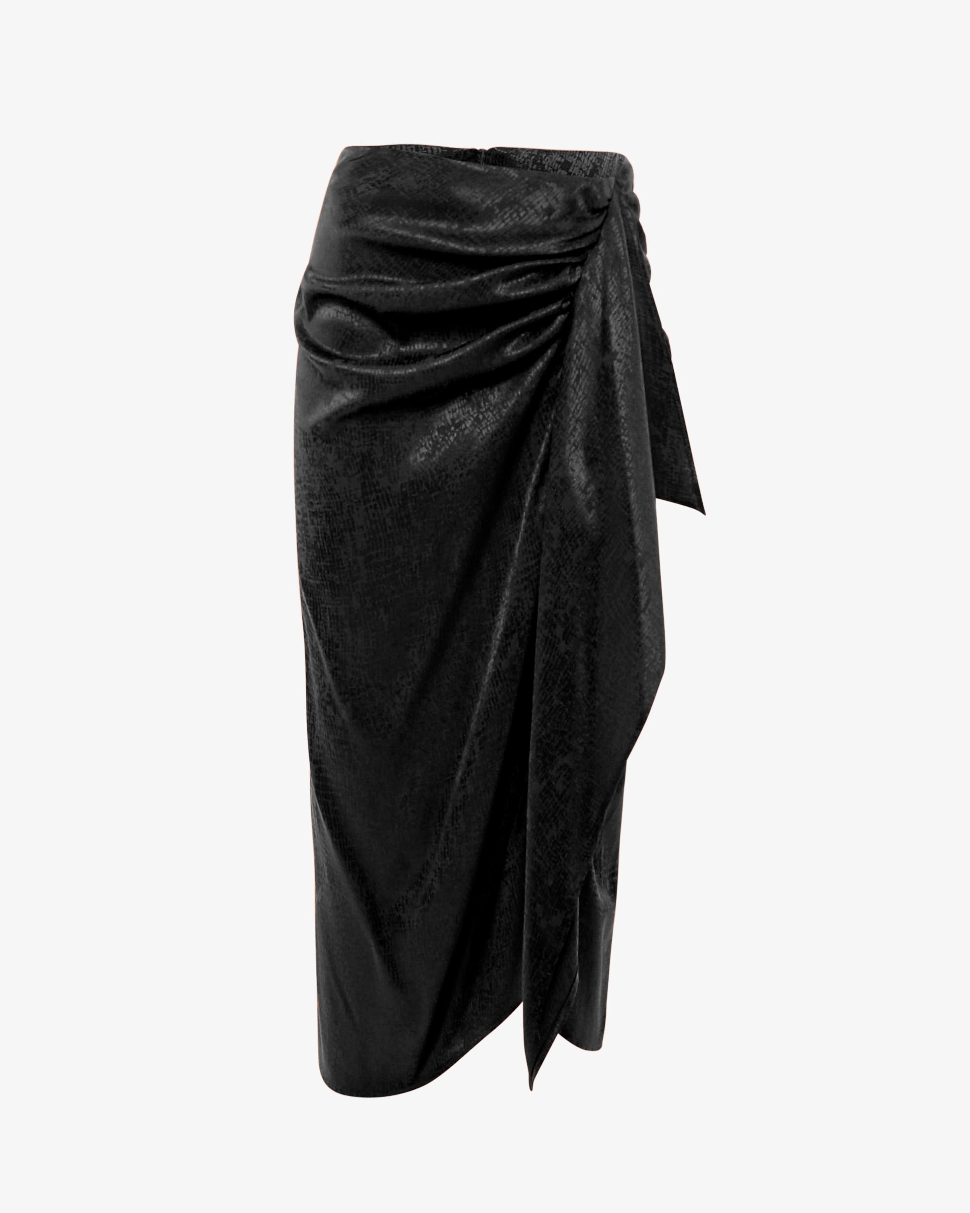 Gonna midi drappeggiata in raffinato tessuto jacquard, ideale per un look elegante e sofisticato. Il design avvolgente valorizza la silhouette, mentre la texture jacquard aggiunge un tocco di classe. Perfetta per cerimonie, eventi o outfit da sera ricercati.