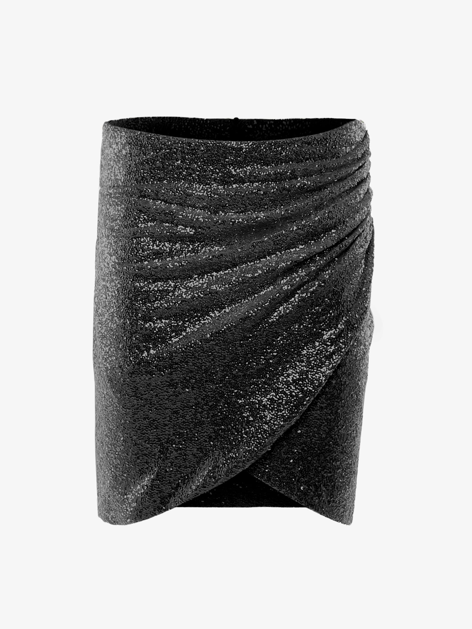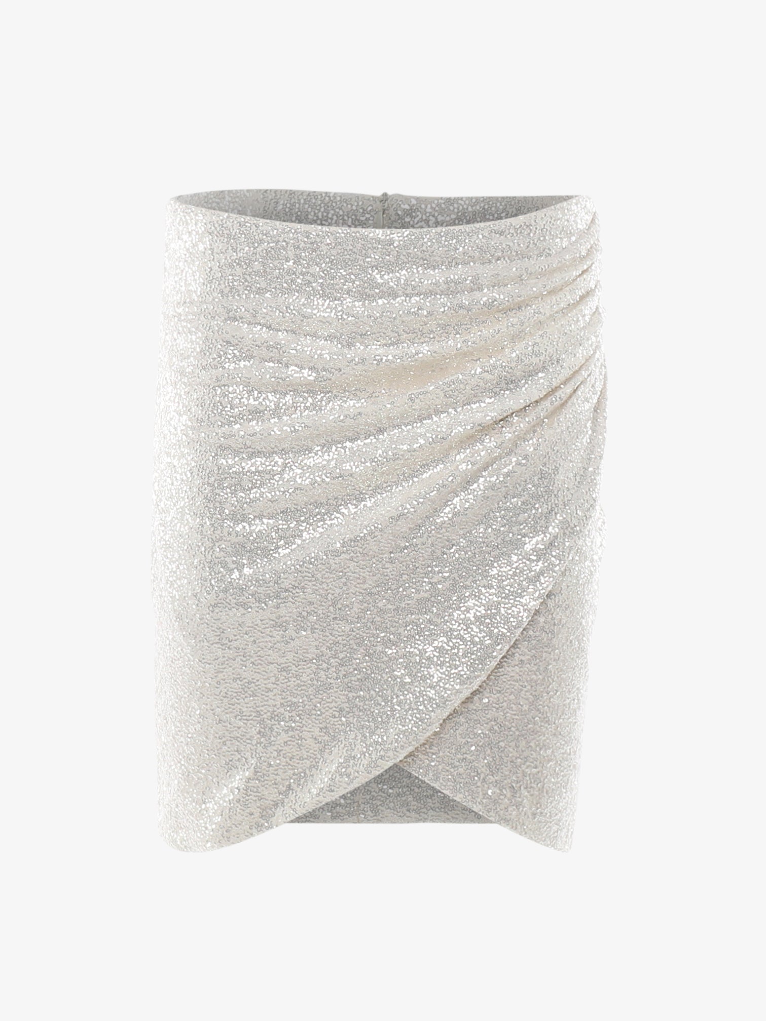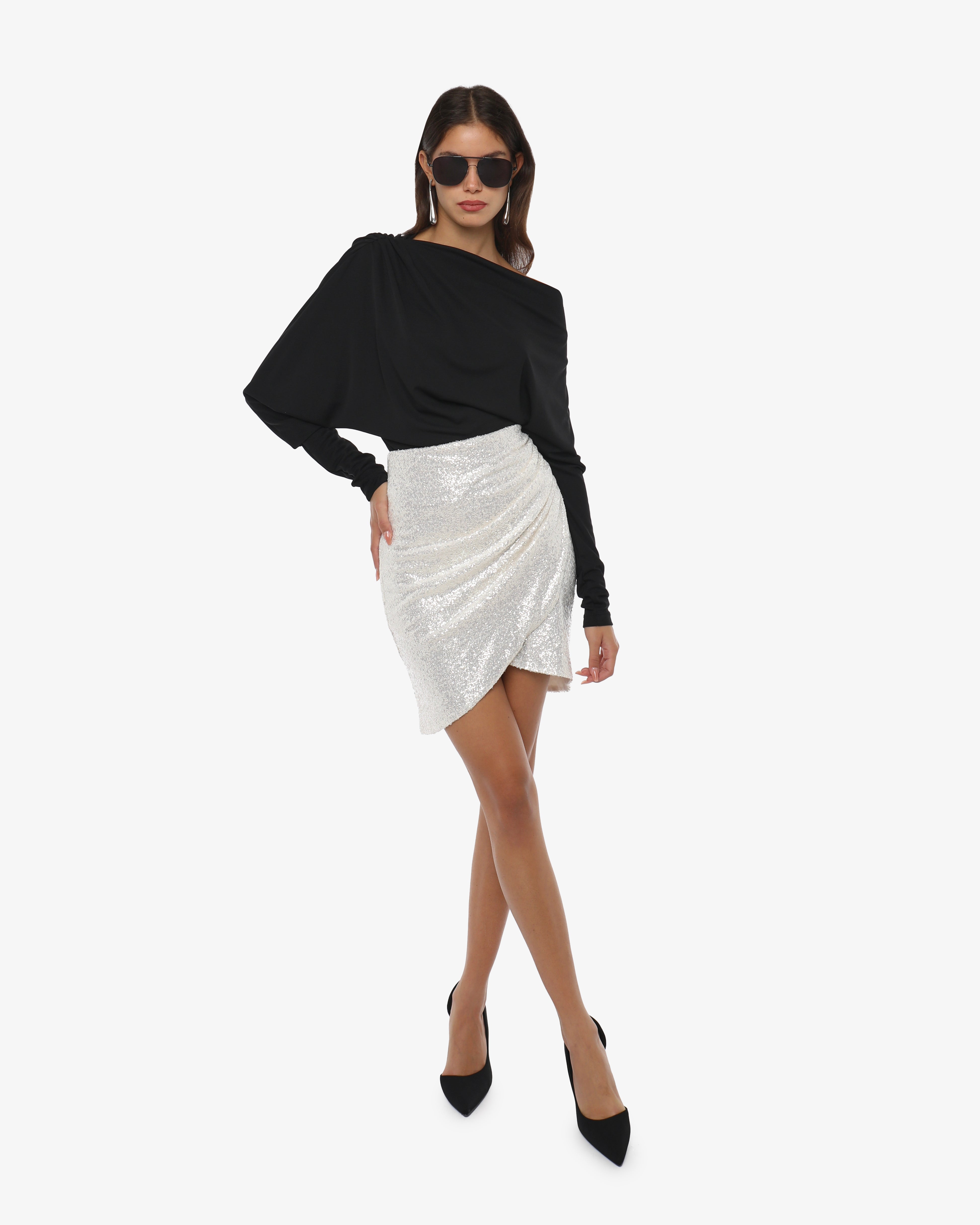 Gonna mini drappeggiata in paillettes, un capo audace e scintillante pensato per serate glamour e occasioni speciali. Realizzata con paillettes luccicanti che catturano la luce a ogni movimento, presenta un design drappeggiato che aggiunge texture e dinamicità alla silhouette. La vita alta e la lunghezza mini esaltano le forme, creando un effetto femminile e accattivante. Perfetta da abbinare a top aderenti, bluse eleganti o body essenziali, completando il look con tacchi vertiginosi e accessori minimal per un outfit da vera star.