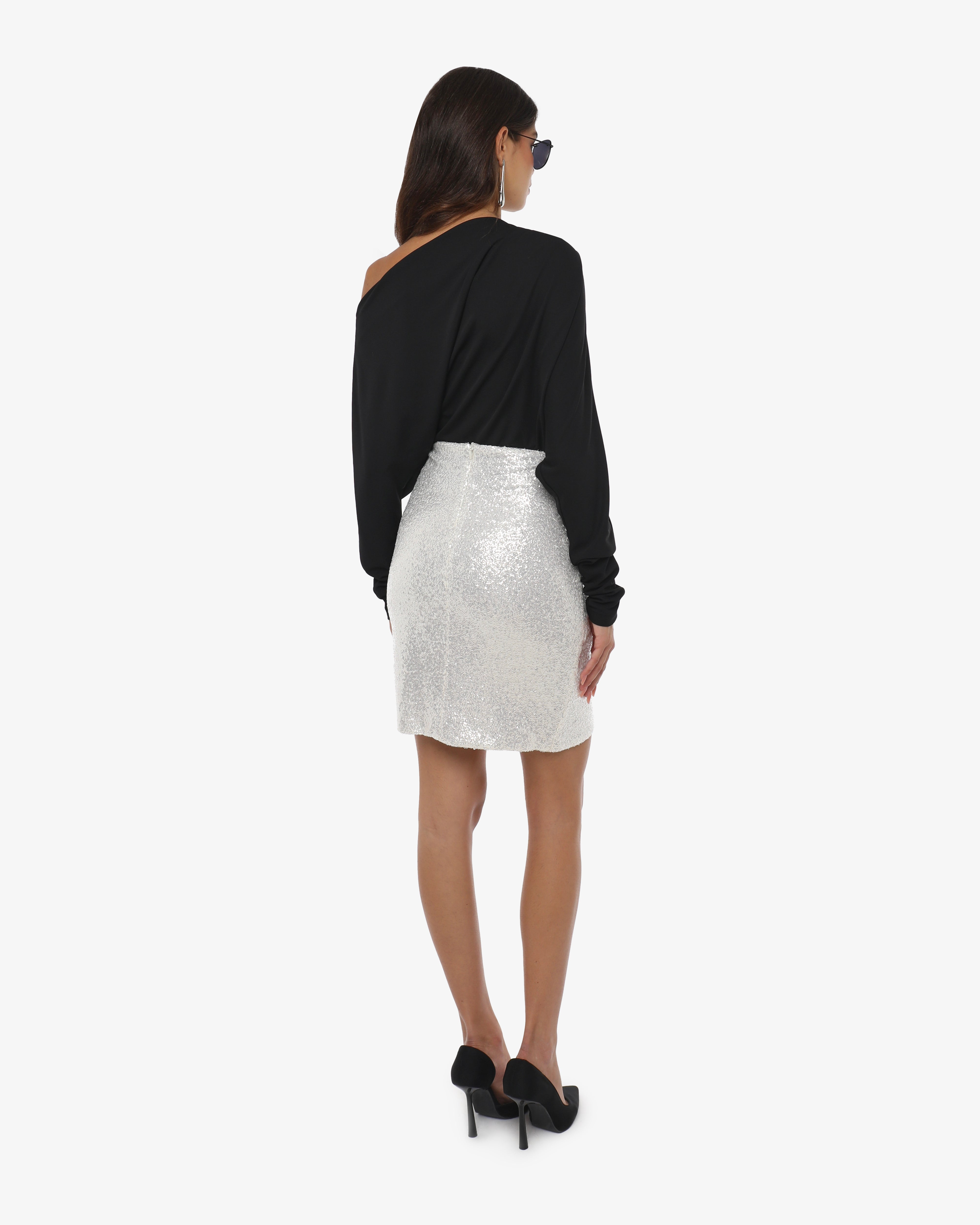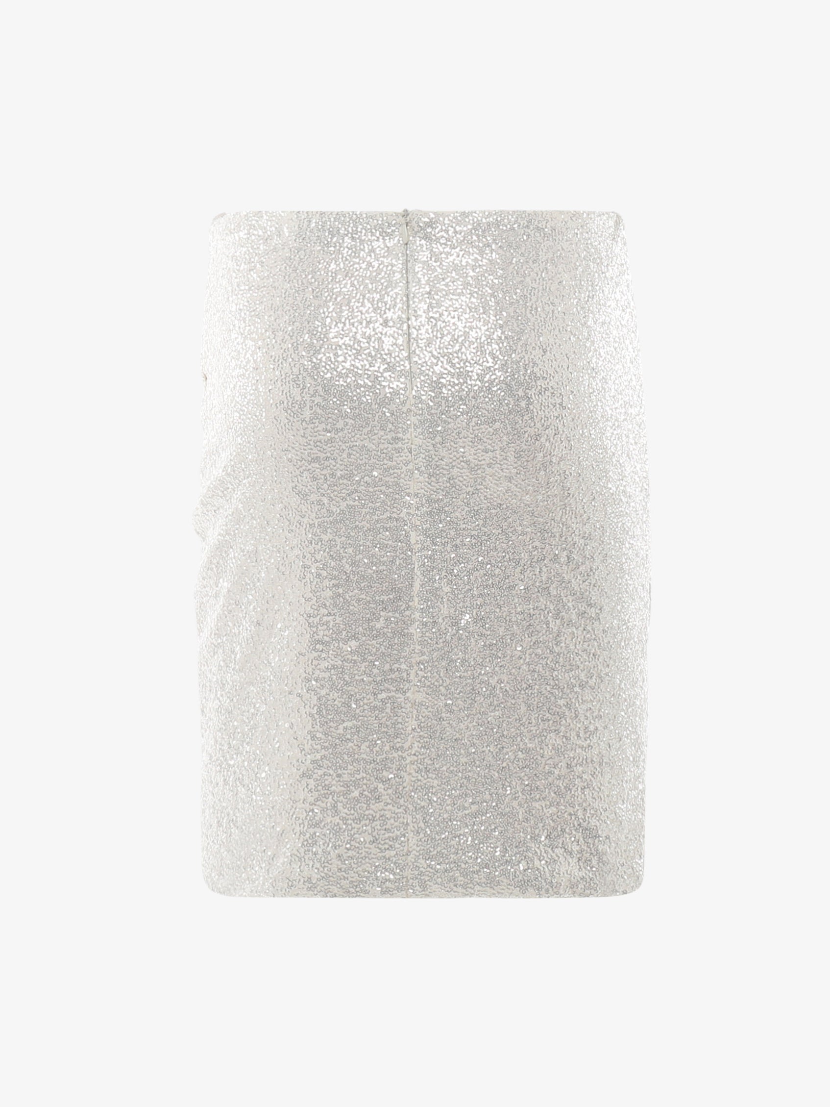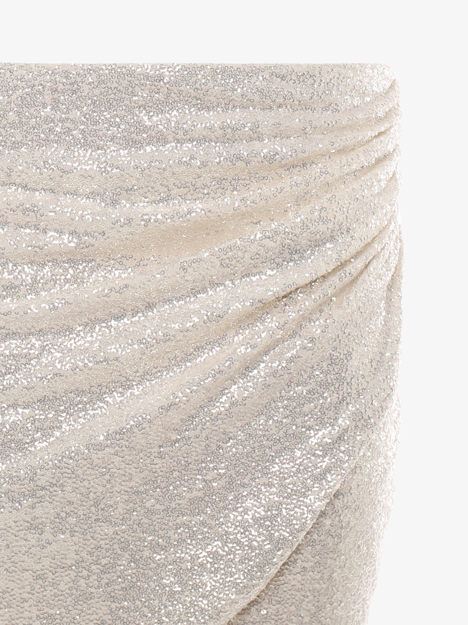 Gonna mini drappeggiata in paillettes, un capo audace e scintillante pensato per serate glamour e occasioni speciali. Realizzata con paillettes luccicanti che catturano la luce a ogni movimento, presenta un design drappeggiato che aggiunge texture e dinamicità alla silhouette. La vita alta e la lunghezza mini esaltano le forme, creando un effetto femminile e accattivante. Perfetta da abbinare a top aderenti, bluse eleganti o body essenziali, completando il look con tacchi vertiginosi e accessori minimal per un outfit da vera star.