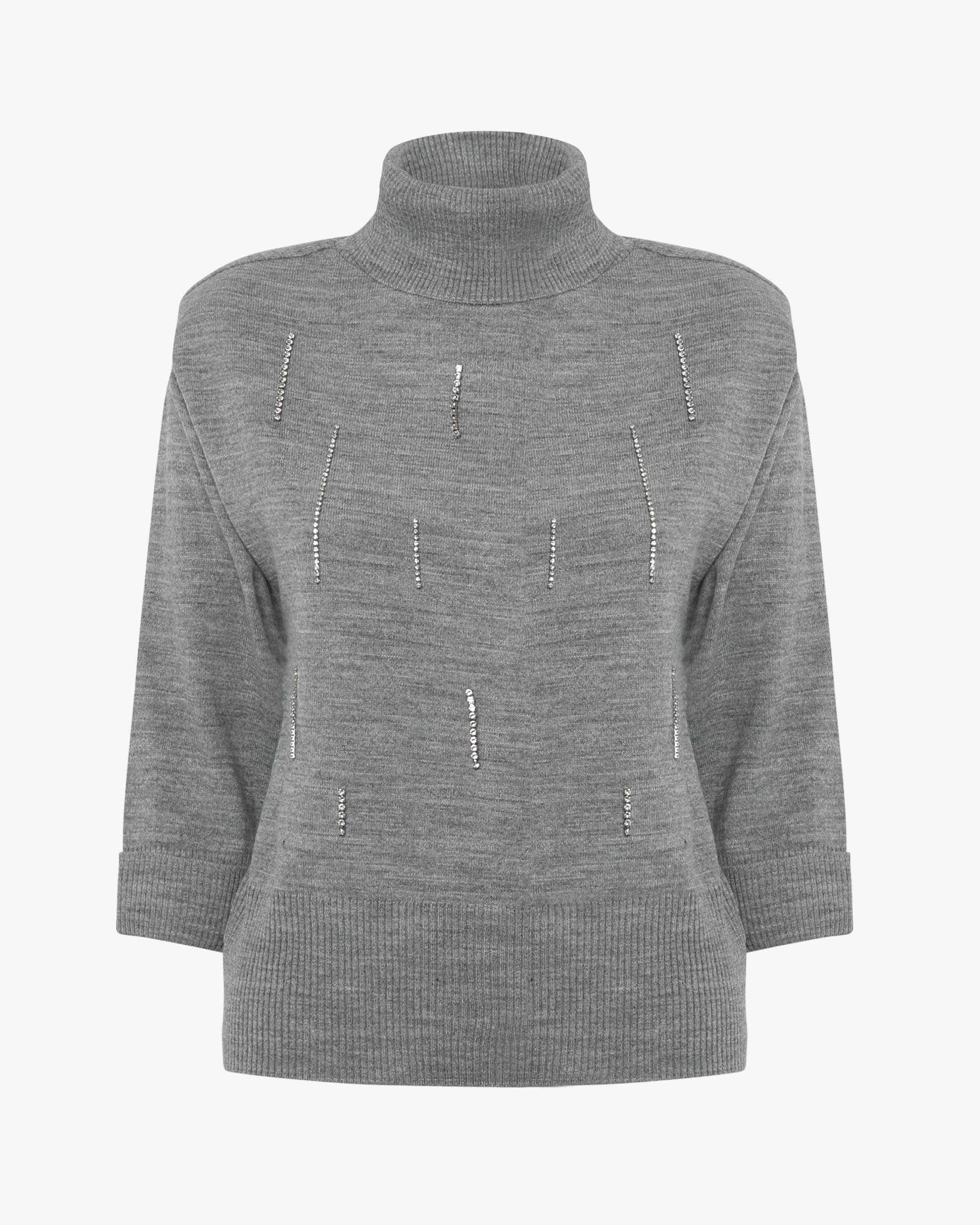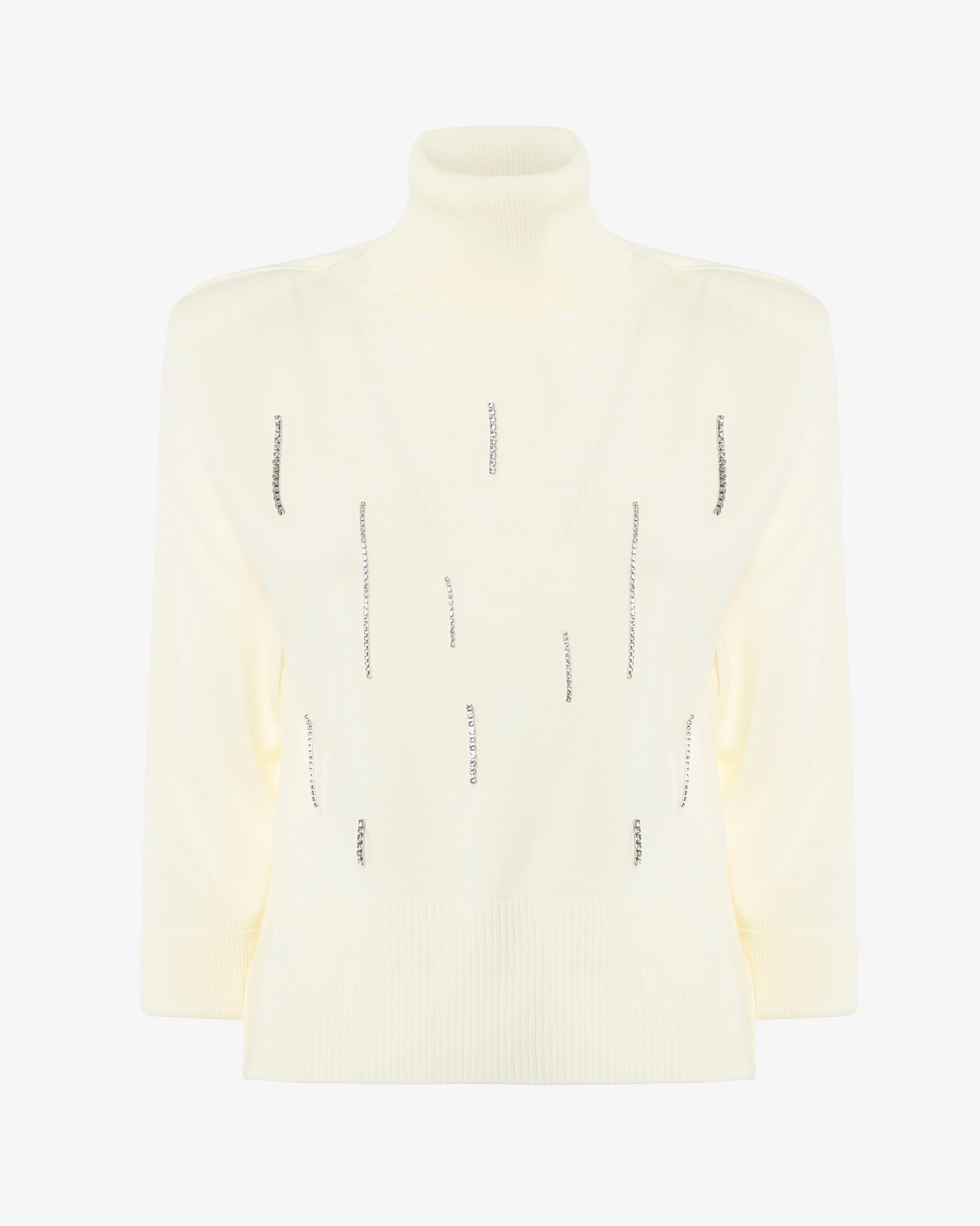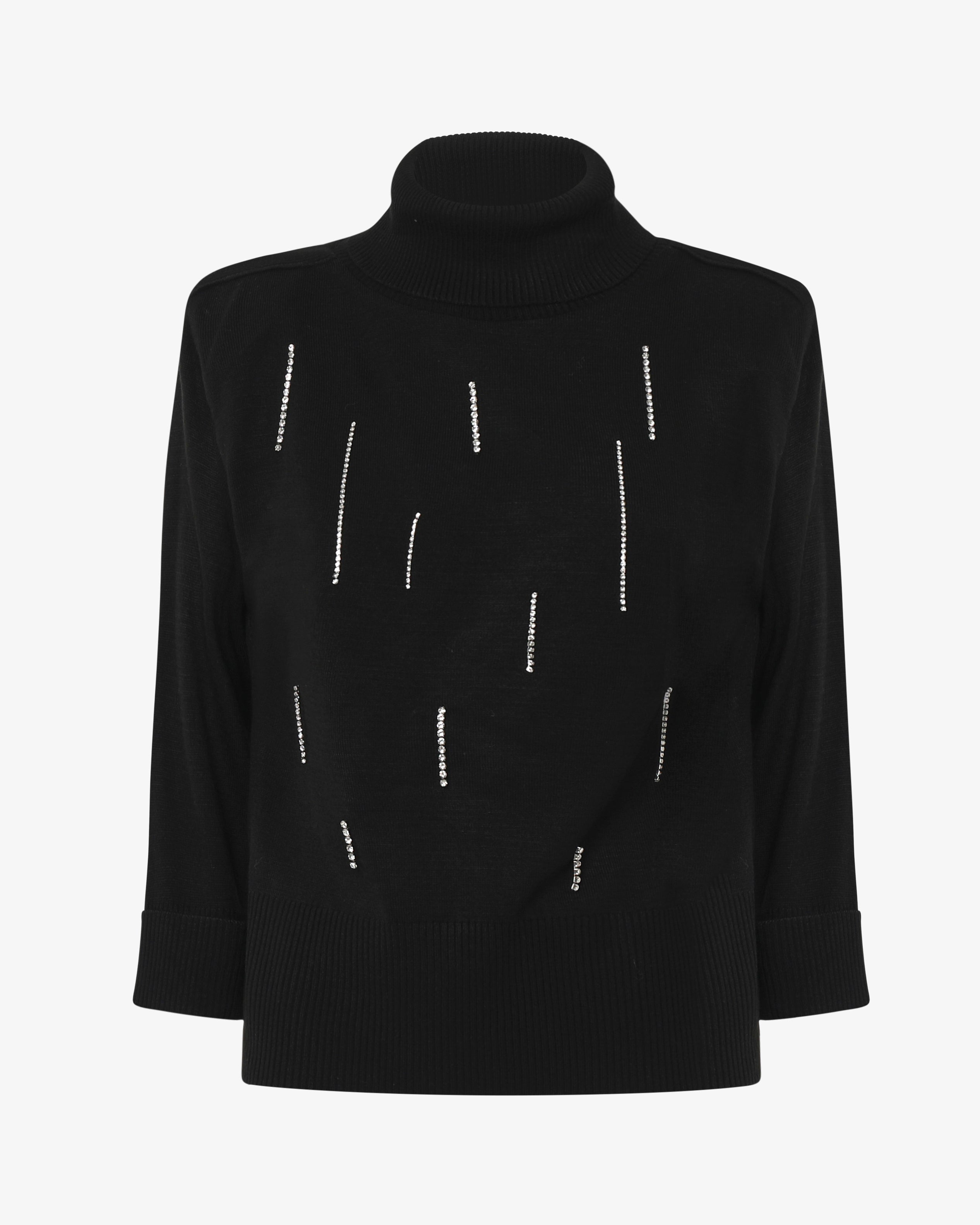 Maglia con collo alto e manica corta con applicazione gioiello, un capo sofisticato che unisce eleganza e praticità. Realizzata in tessuto morbido ed elasticizzato, offre una vestibilità aderente che valorizza la silhouette. Il collo alto aggiunge un tocco classico e raffinato, mentre le maniche corte la rendono ideale per look stratificati o per essere indossata da sola in occasioni più informali.