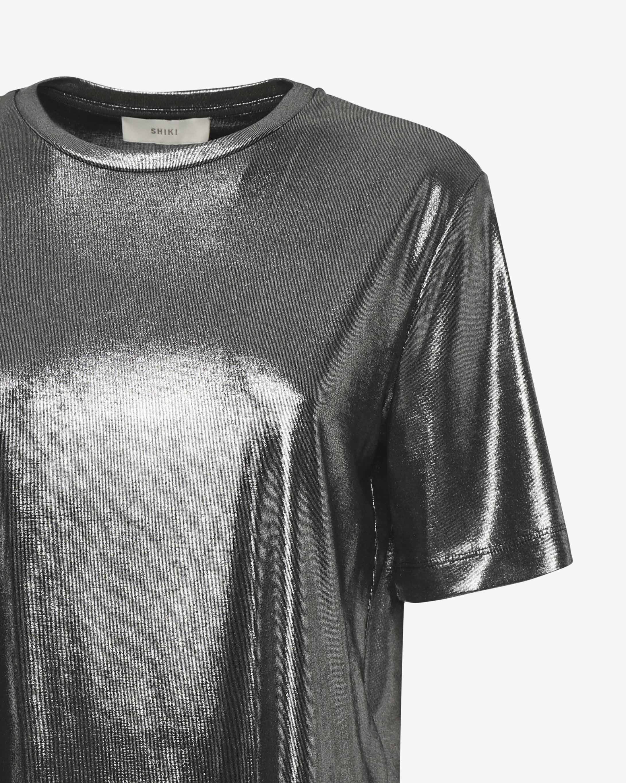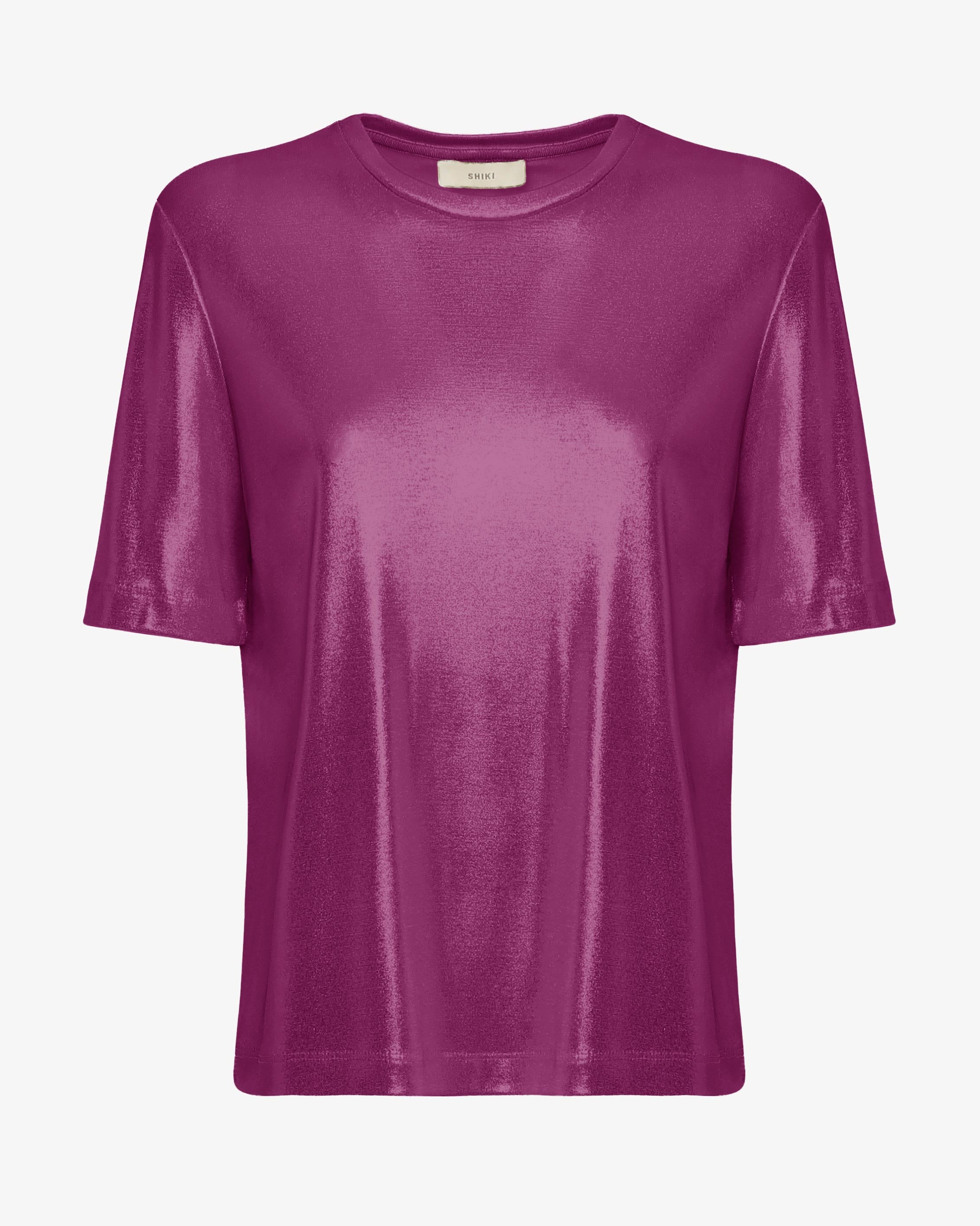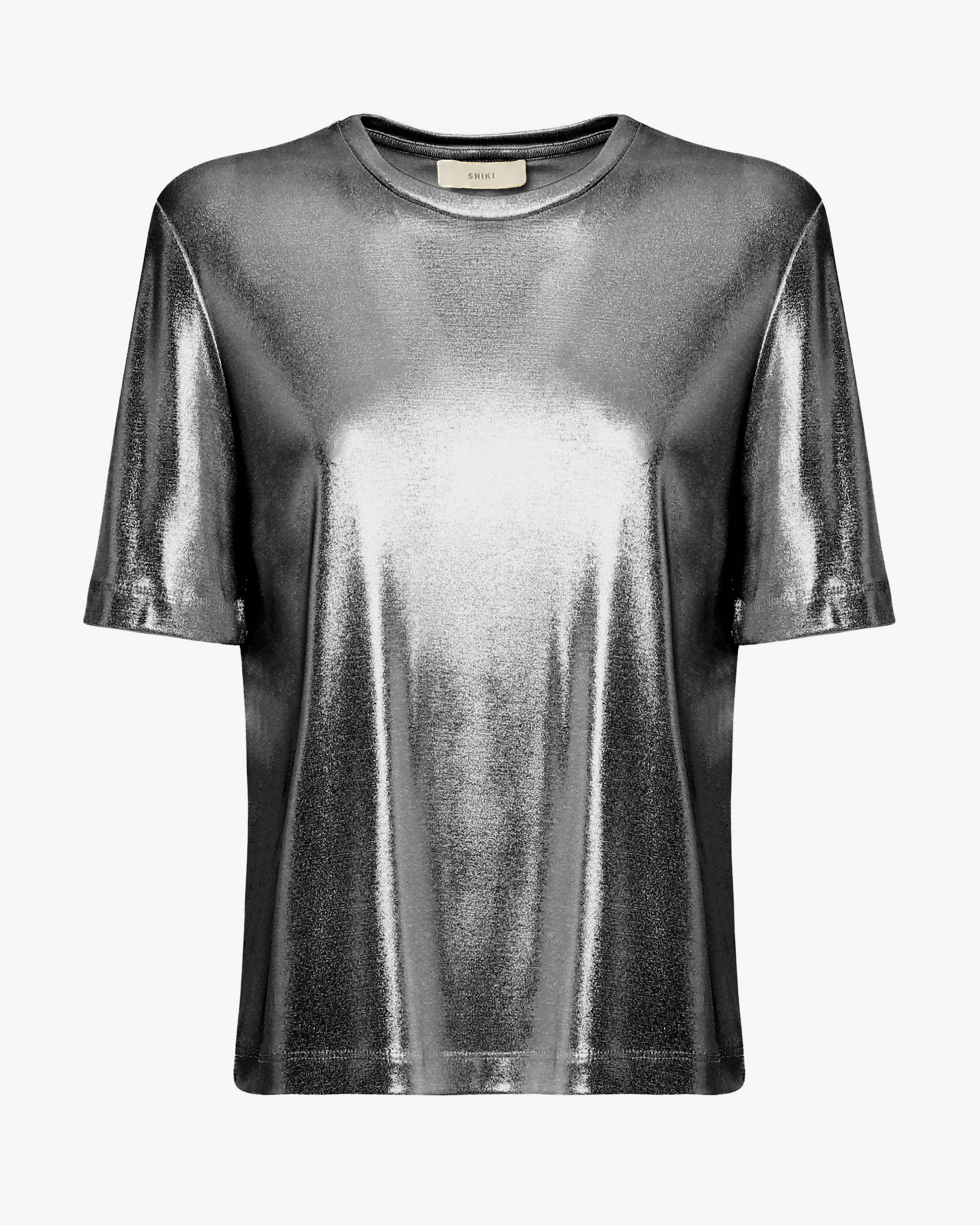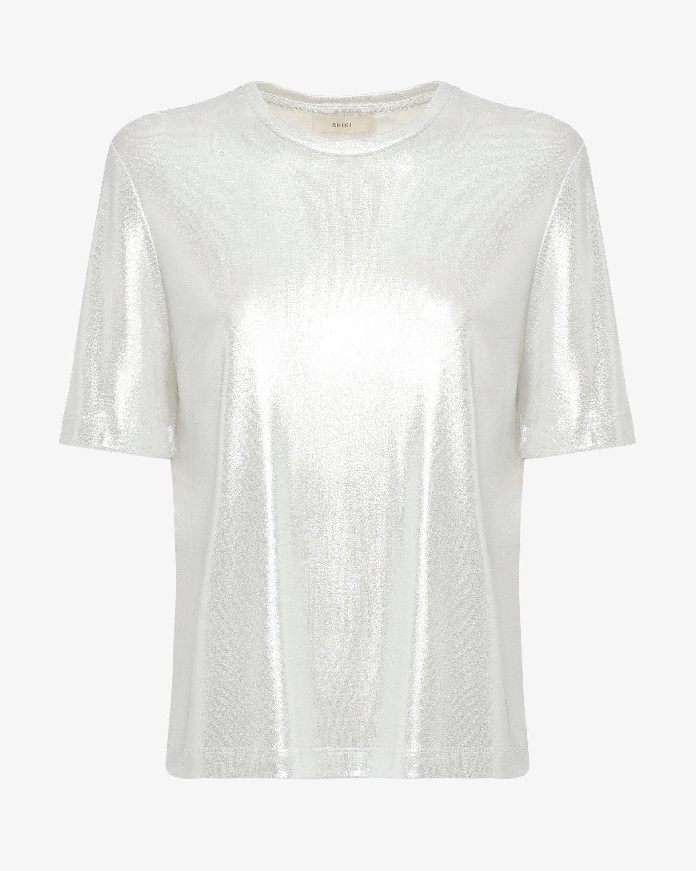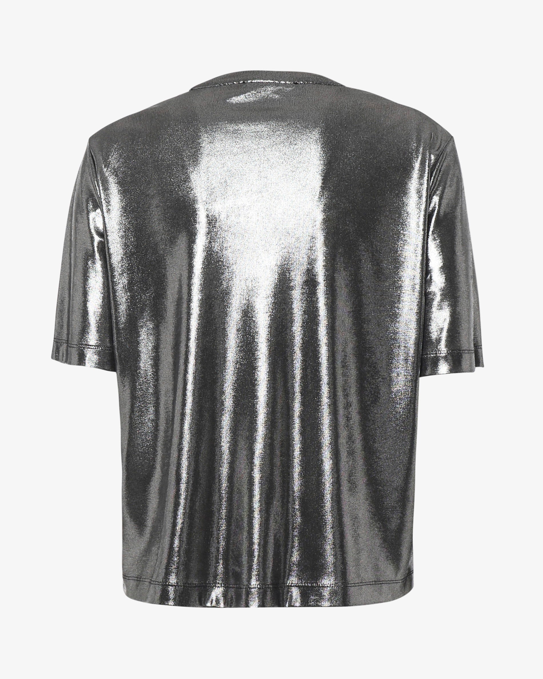 T-shirt in jersey laminato, un capo versatile che combina comfort e stile con un tocco glamour. Realizzata in tessuto jersey morbido ed elasticizzato, presenta una finitura laminata che dona una luminosità elegante e contemporanea. La vestibilità è comoda e aderente al punto giusto, rendendola perfetta per creare look sia casual che sofisticati. Ideale per serate speciali o outfit quotidiani con un tocco chic, si abbina a jeans, gonne a vita alta o pantaloni eleganti