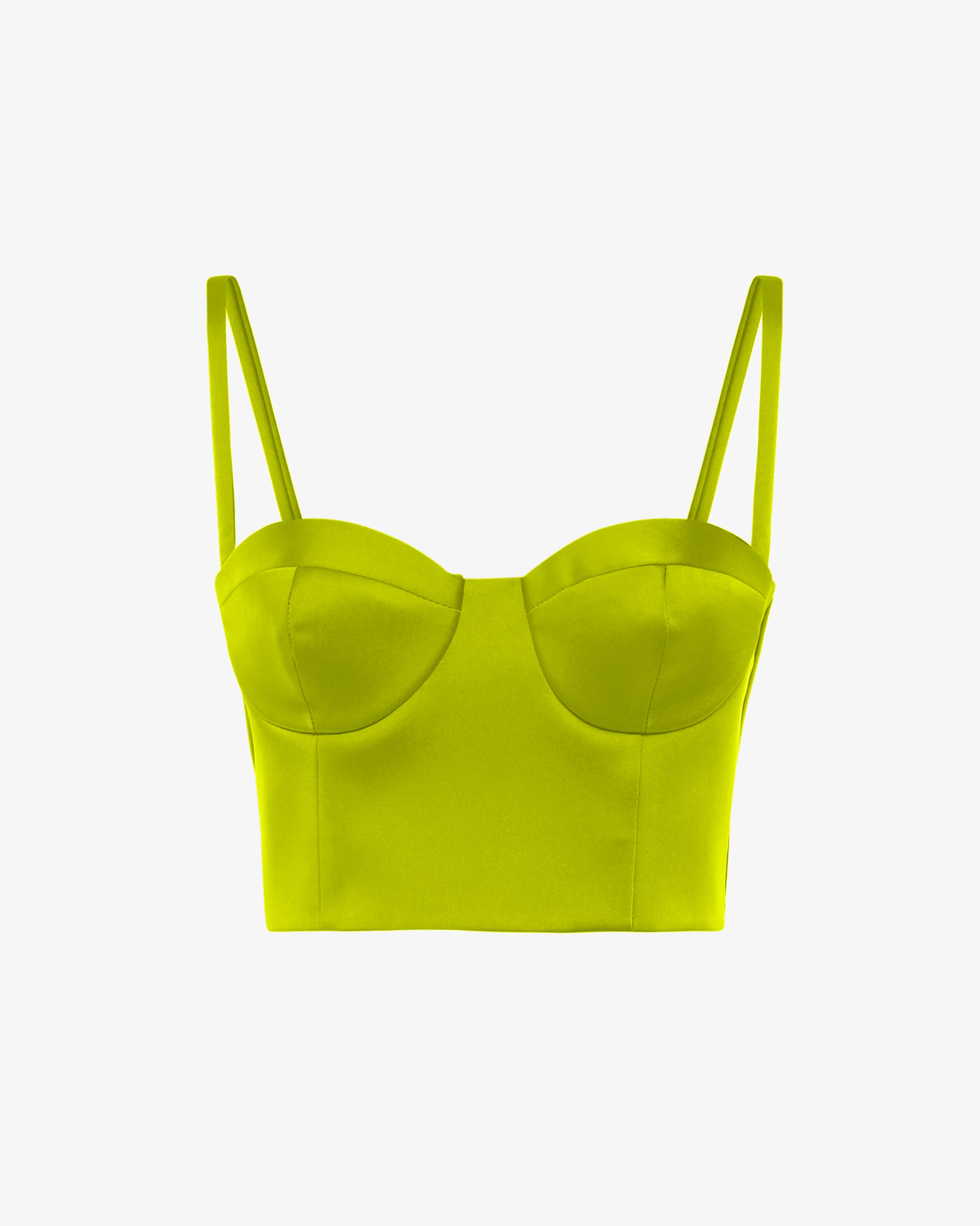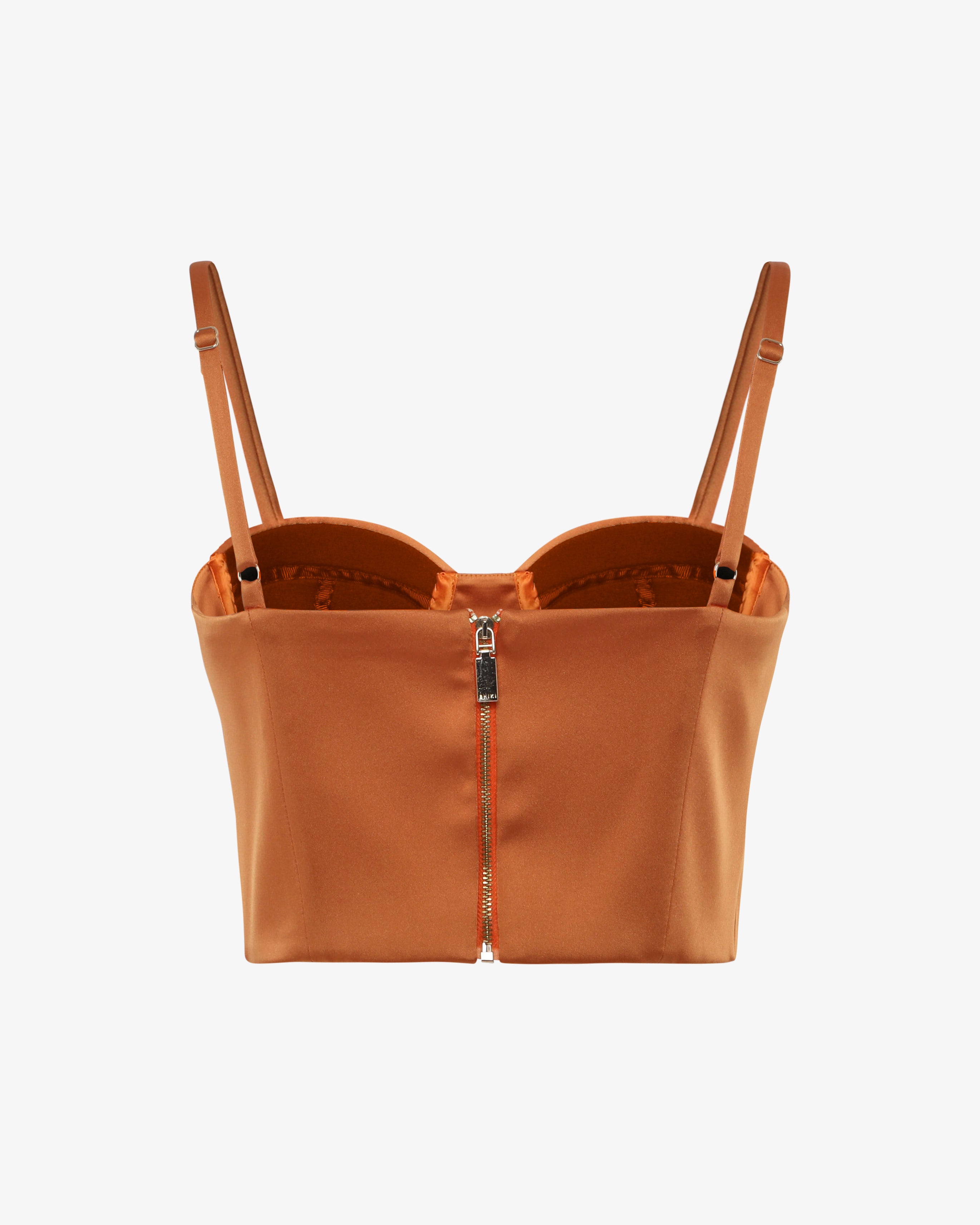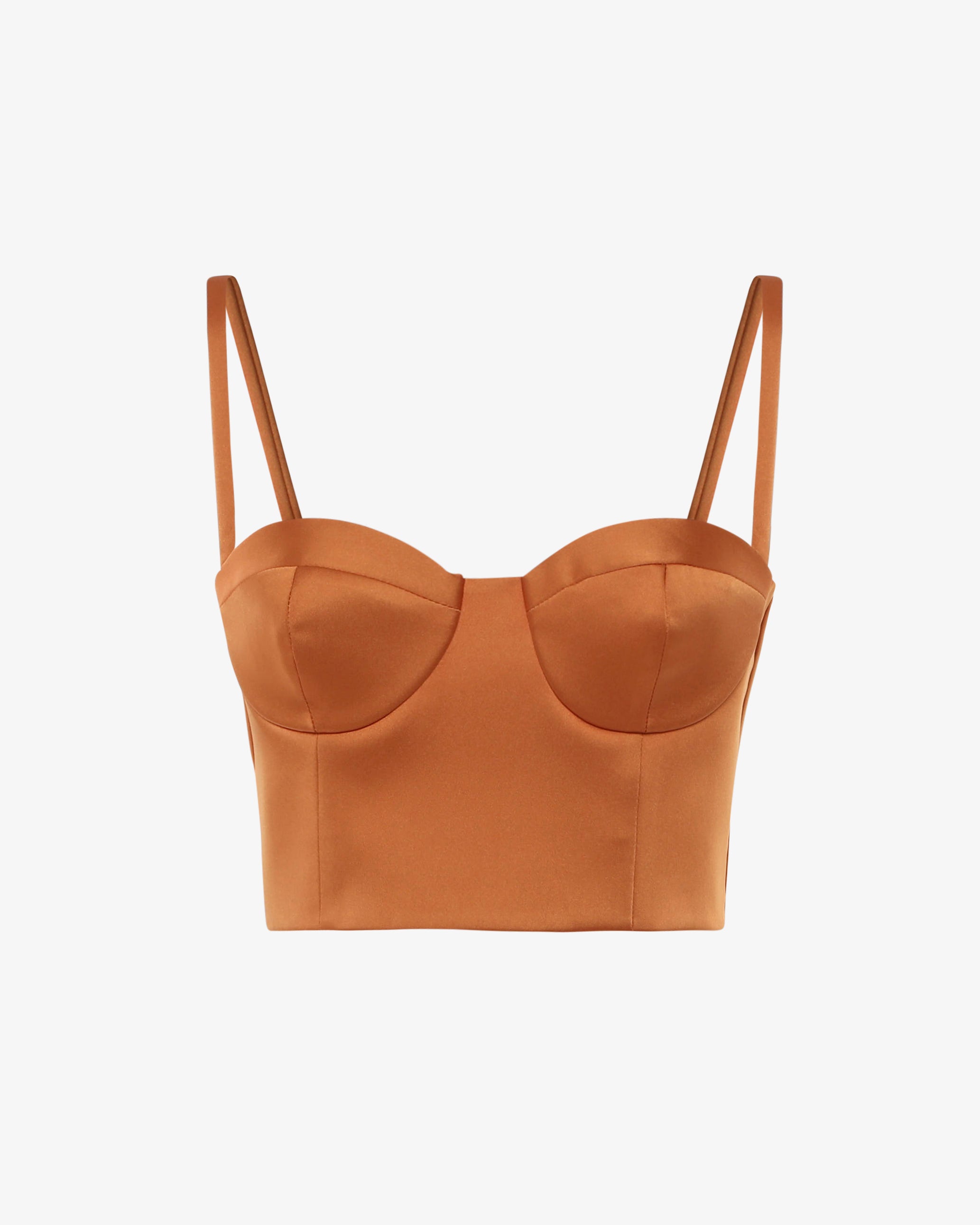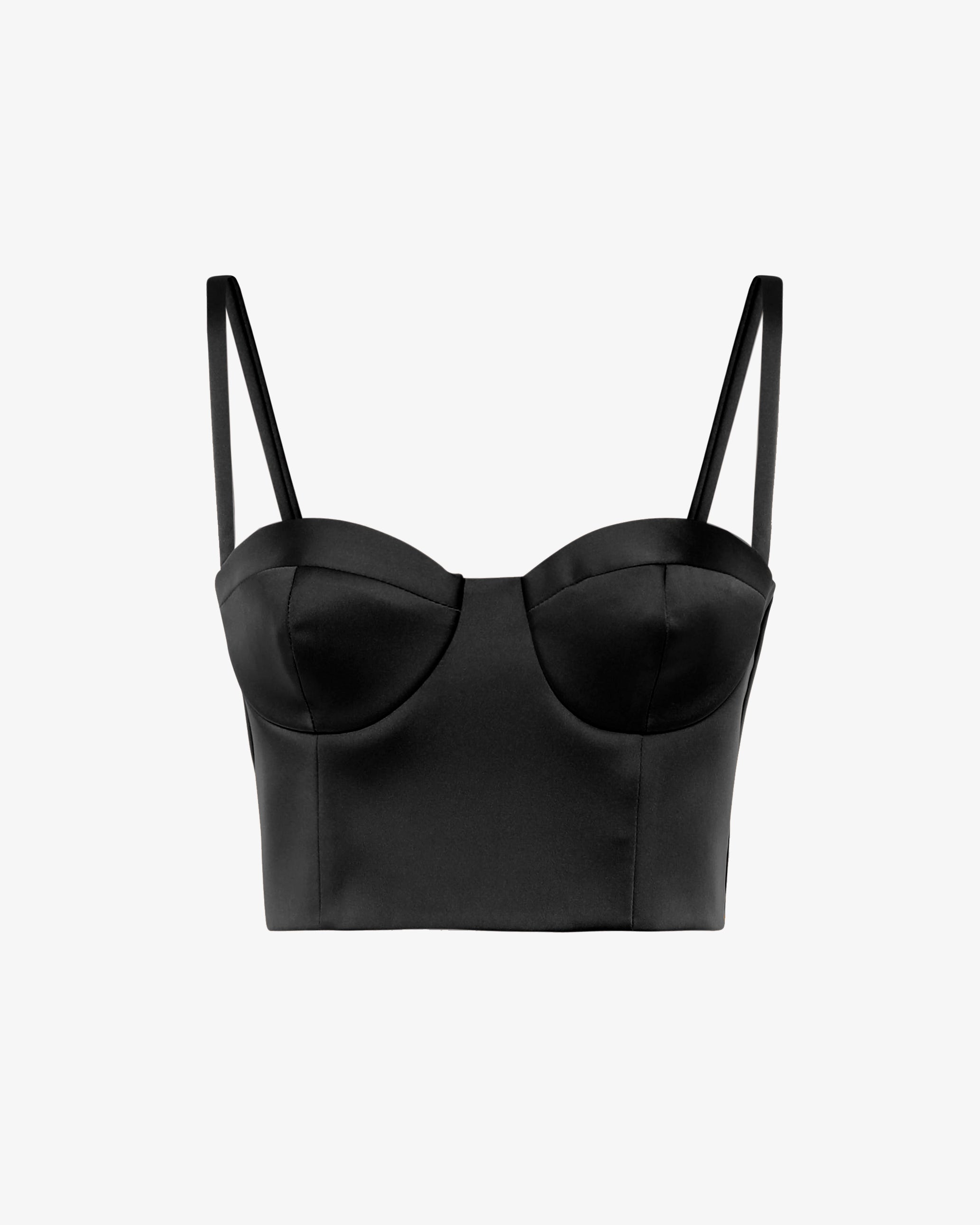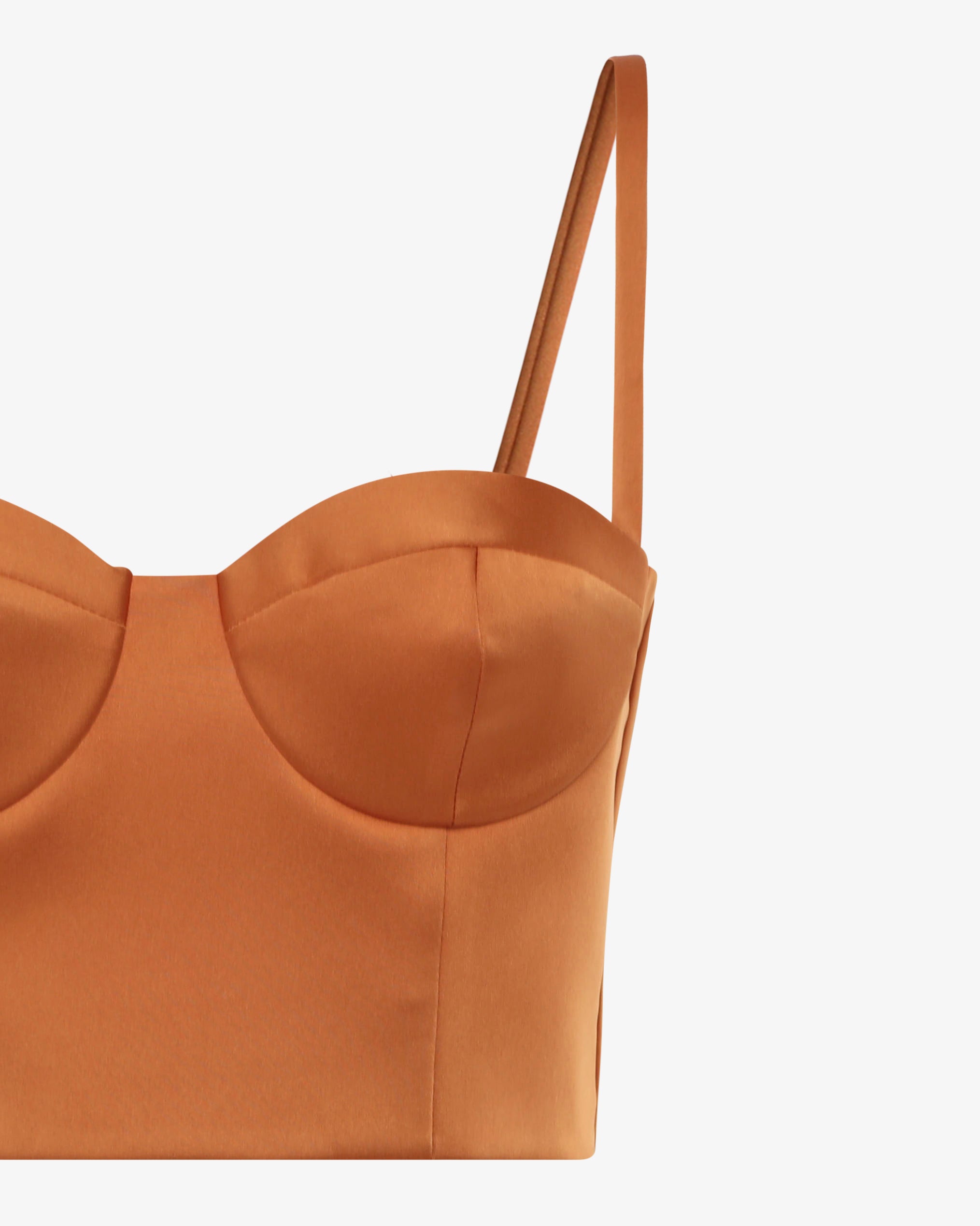 Top a bustino in satin lucido, perfetto per un look elegante e seducente. Il design aderente valorizza la silhouette, mentre il tessuto satinato dona un effetto luminoso e sofisticato. Ideale da indossare con pantaloni a vita alta o gonne per serate, eventi o occasioni speciali.