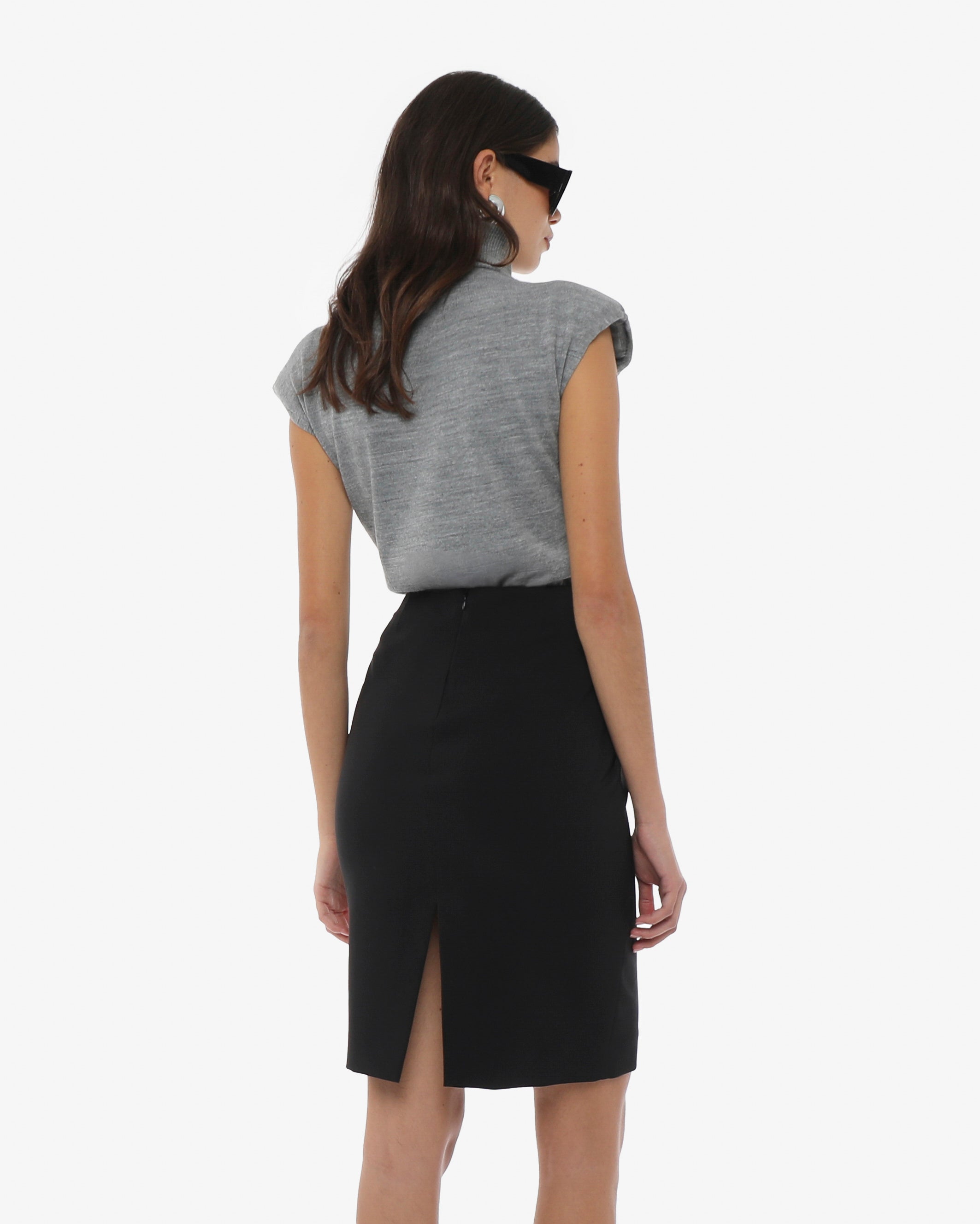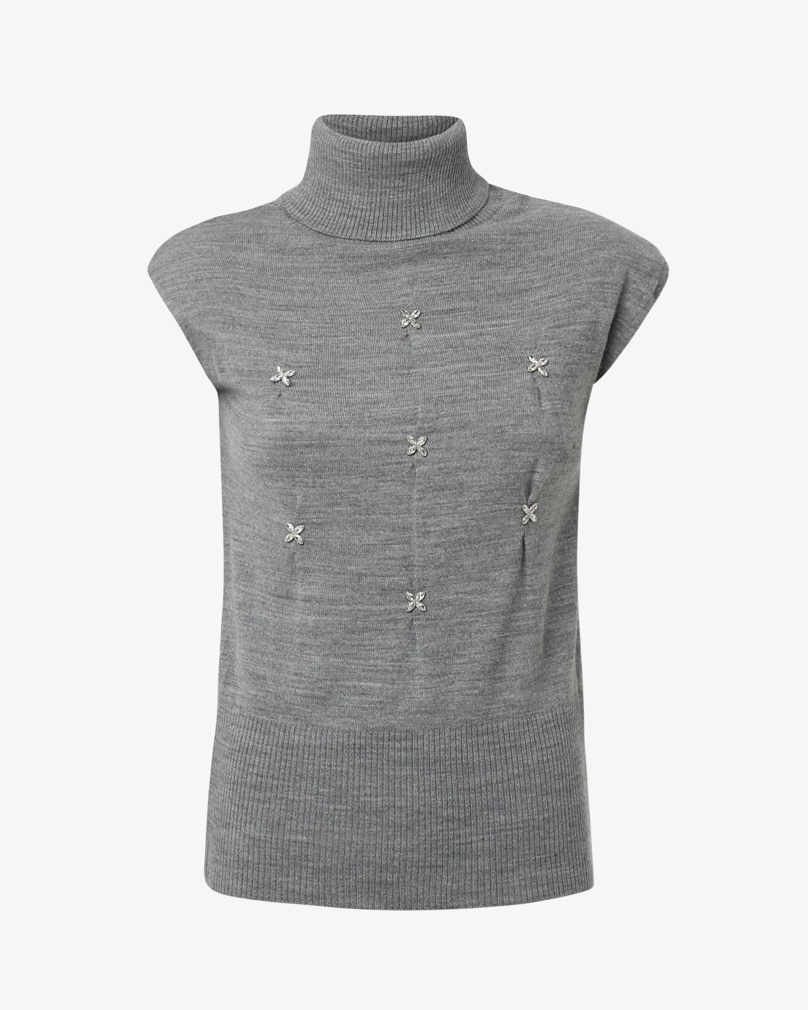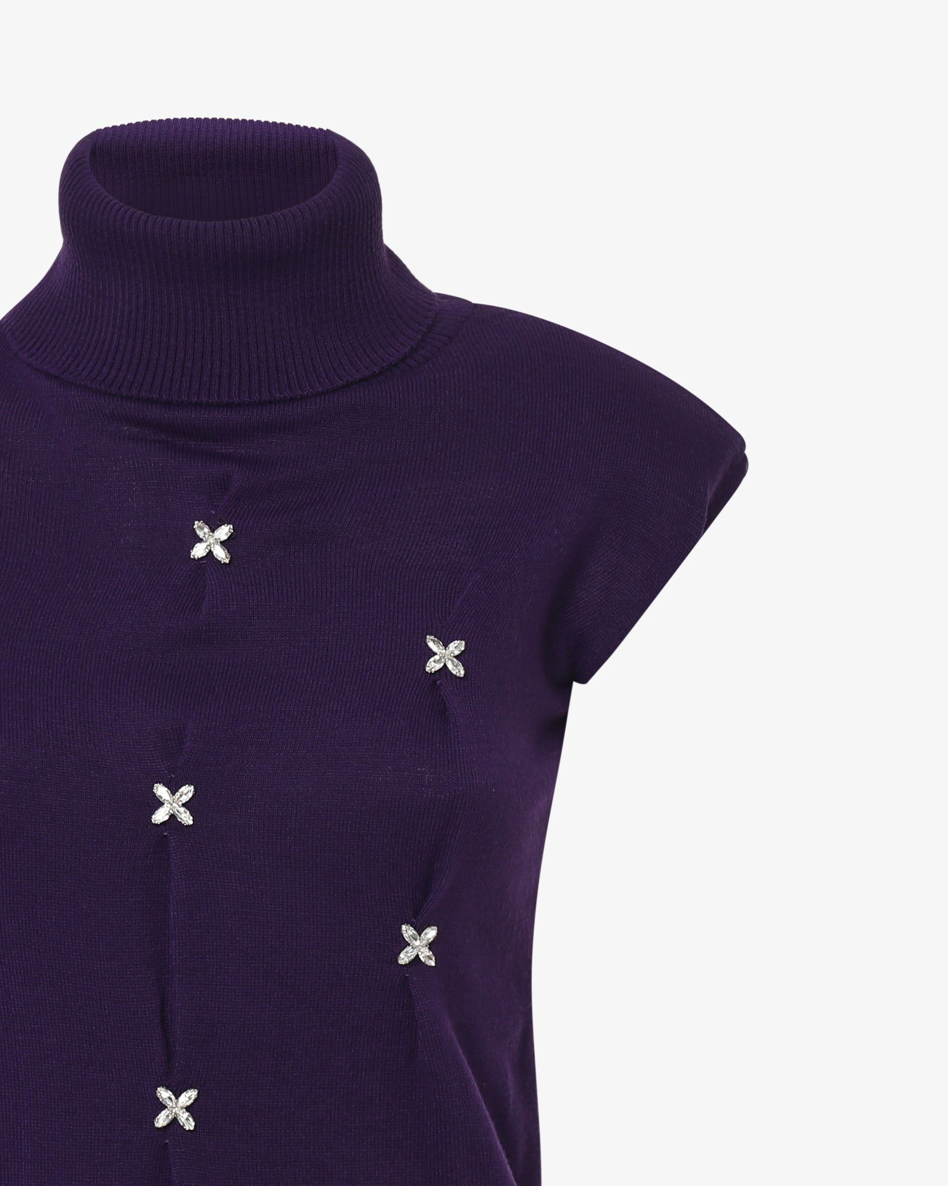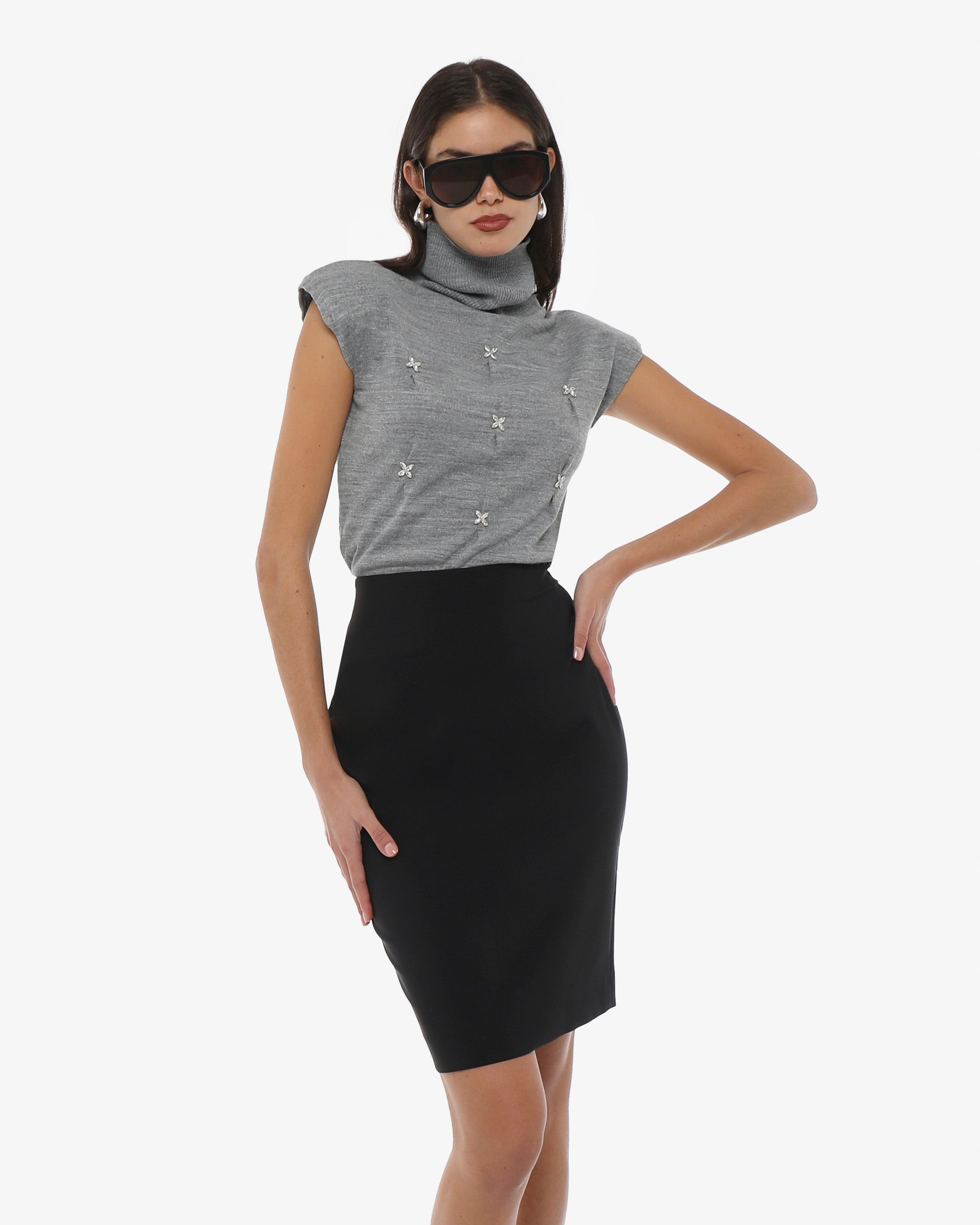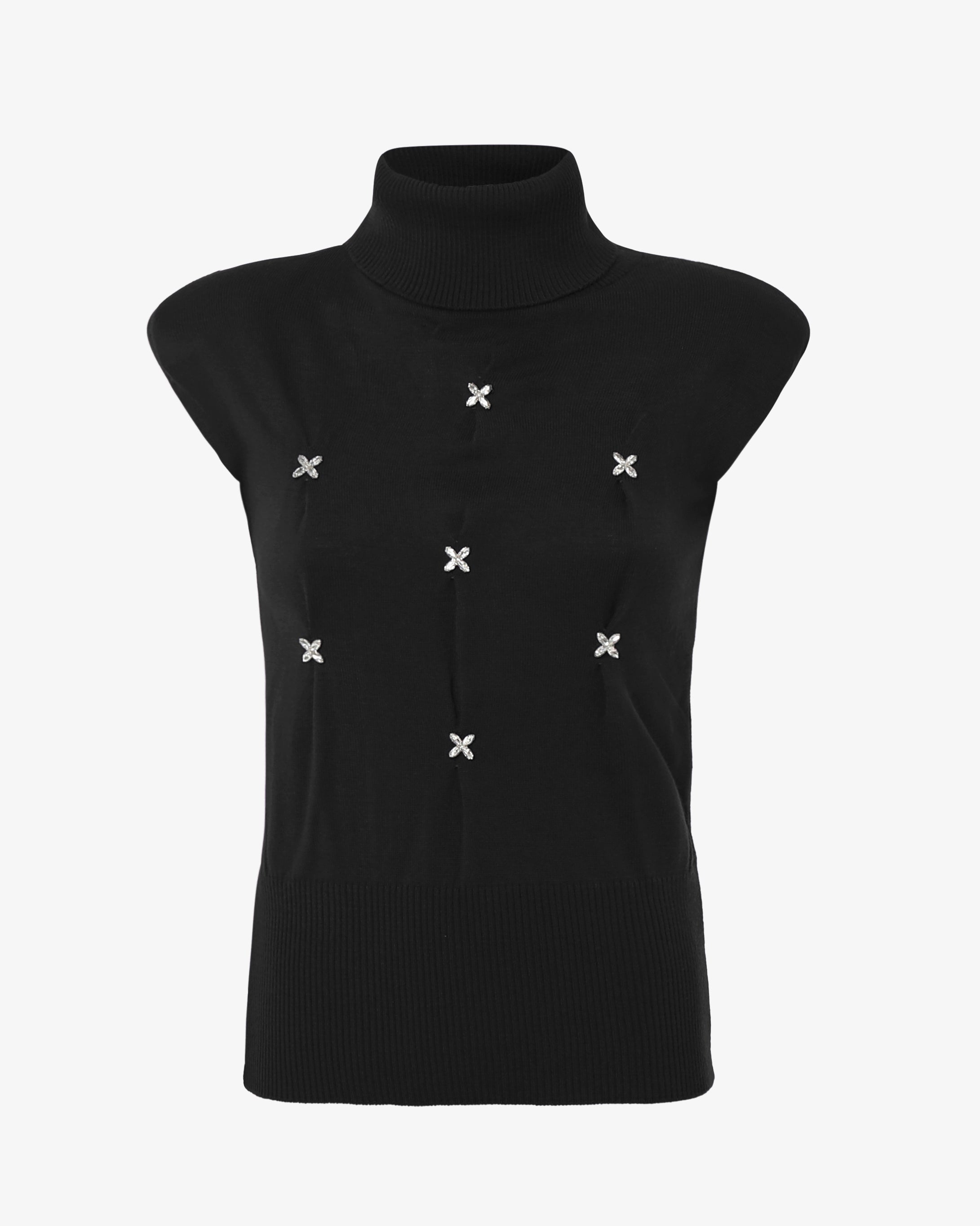 Top a collo alto senza maniche con applicazione gioiello, un capo elegante e sofisticato che combina minimalismo e lusso. Realizzato in un tessuto morbido ed elasticizzato, offre una vestibilità aderente e confortevole. Il collo alto conferisce un tocco di classe, mentre l'applicazione gioiello, posizionata strategicamente sul colletto o lungo la scollatura, aggiunge un elemento prezioso e luminoso. Perfetto per occasioni speciali, cene eleganti o eventi formali, si abbina a gonne a matita, pantaloni sartoriali o gonne midi per un look raffinato e impeccabile.