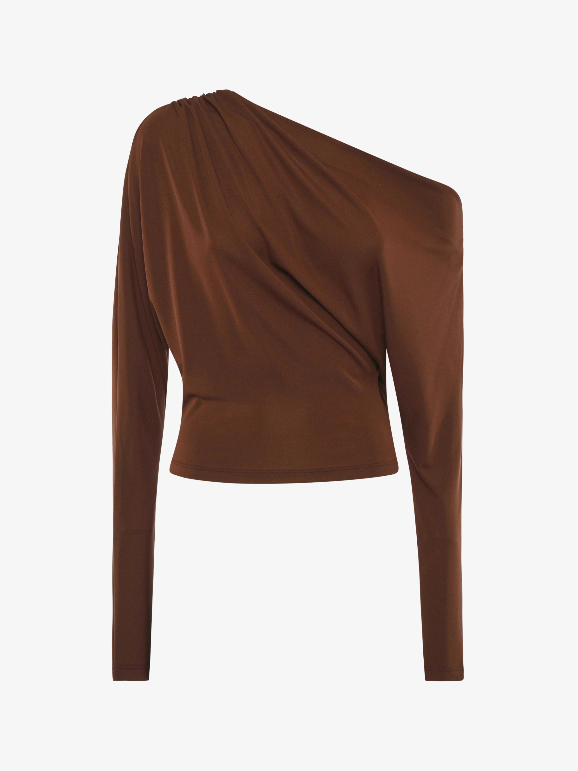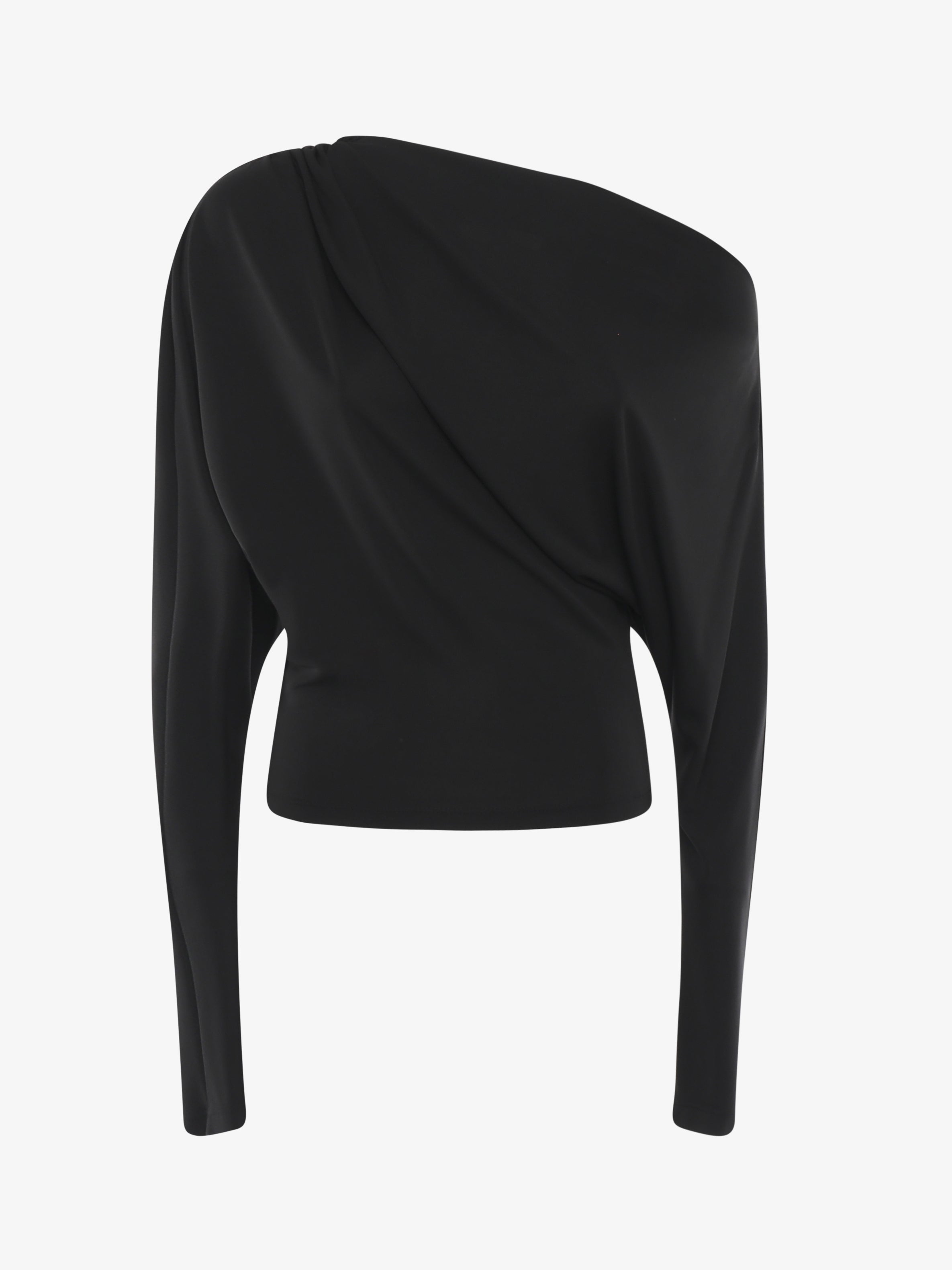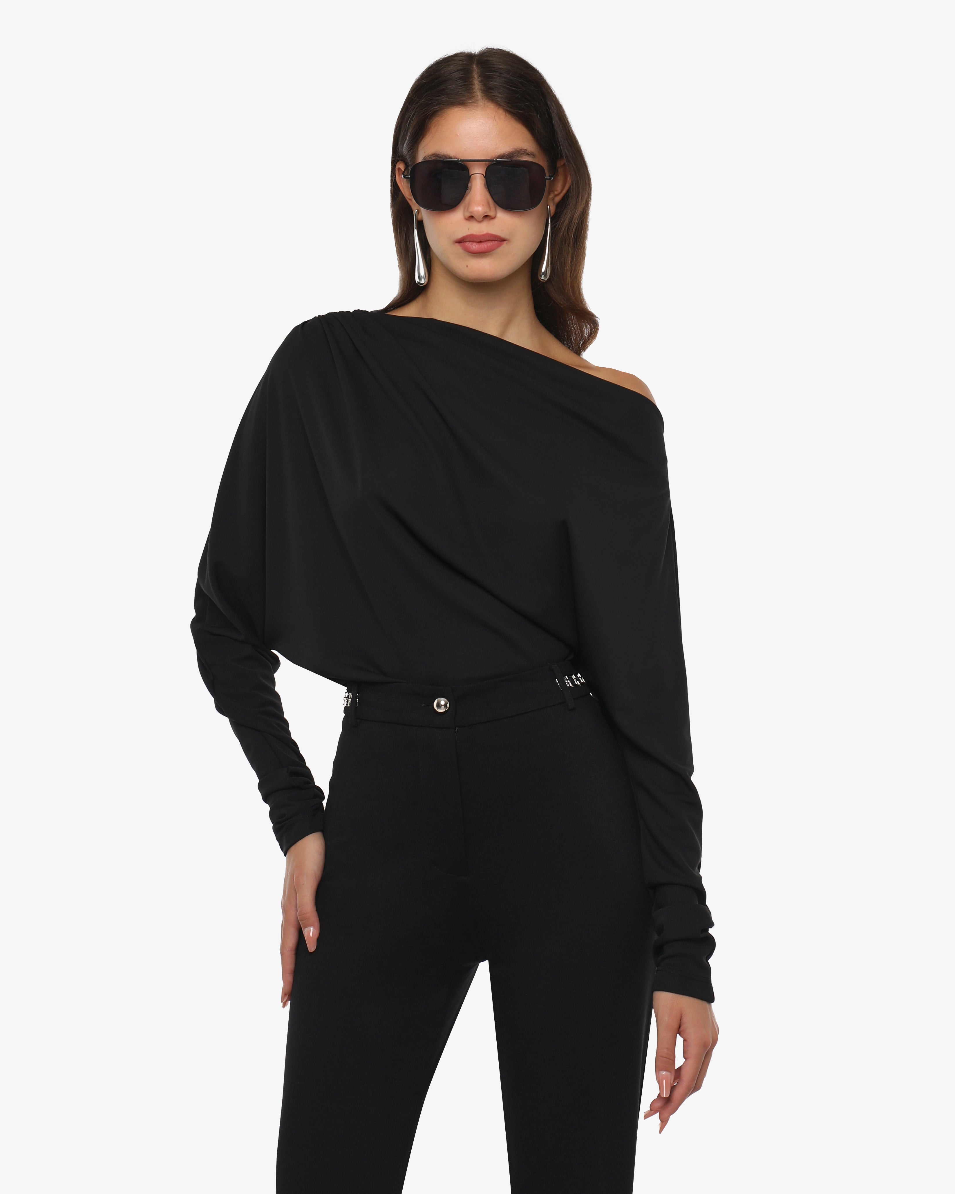 Top in jersey con scollatura asimmetrica, un capo moderno e sofisticato che aggiunge un tocco di originalità a qualsiasi look. Realizzato in tessuto morbido ed elasticizzato, offre una vestibilità aderente che valorizza la silhouette. La scollatura asimmetrica crea un gioco di linee dinamiche e intriganti, lasciando una spalla scoperta per un effetto elegante e contemporaneo.
