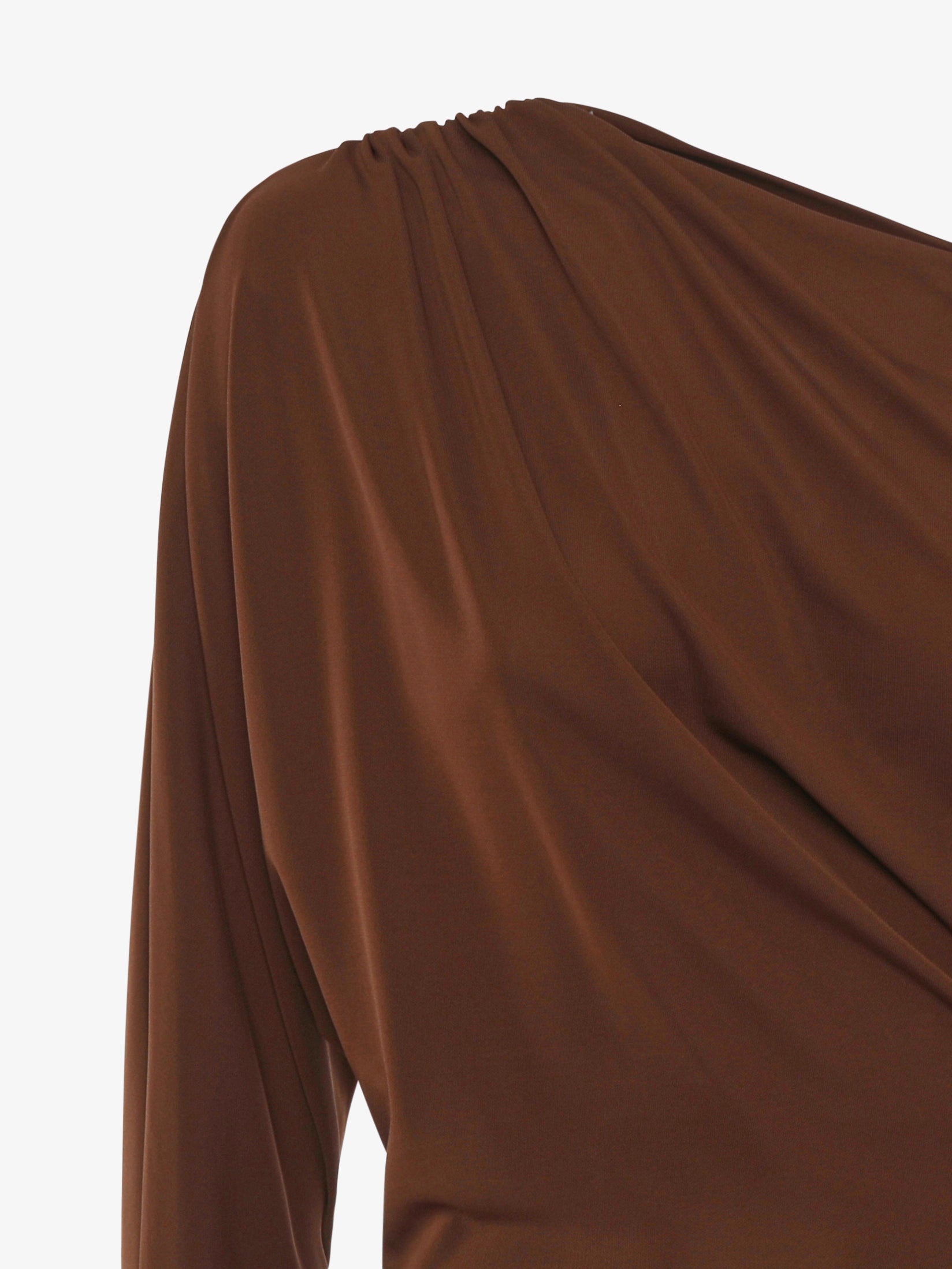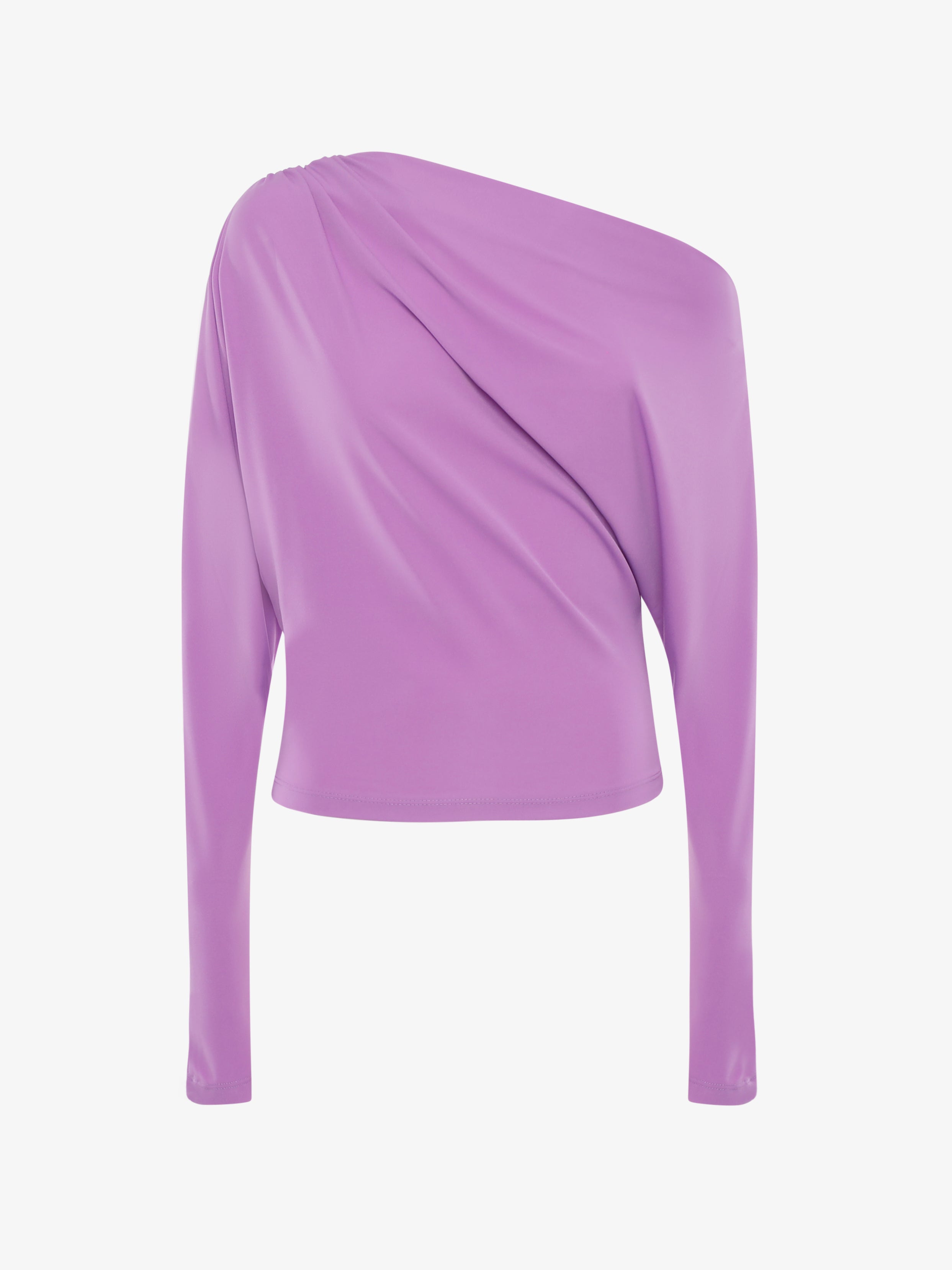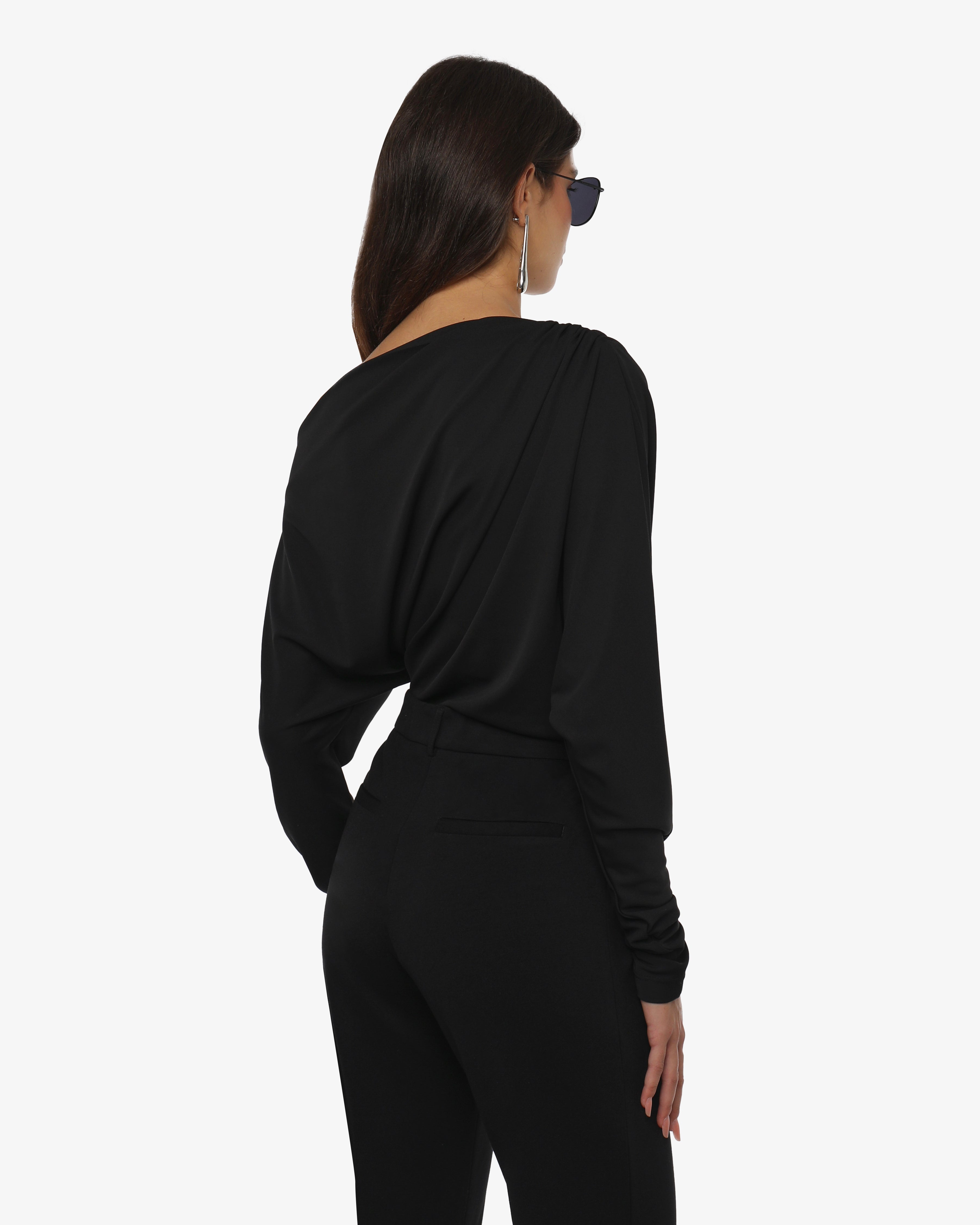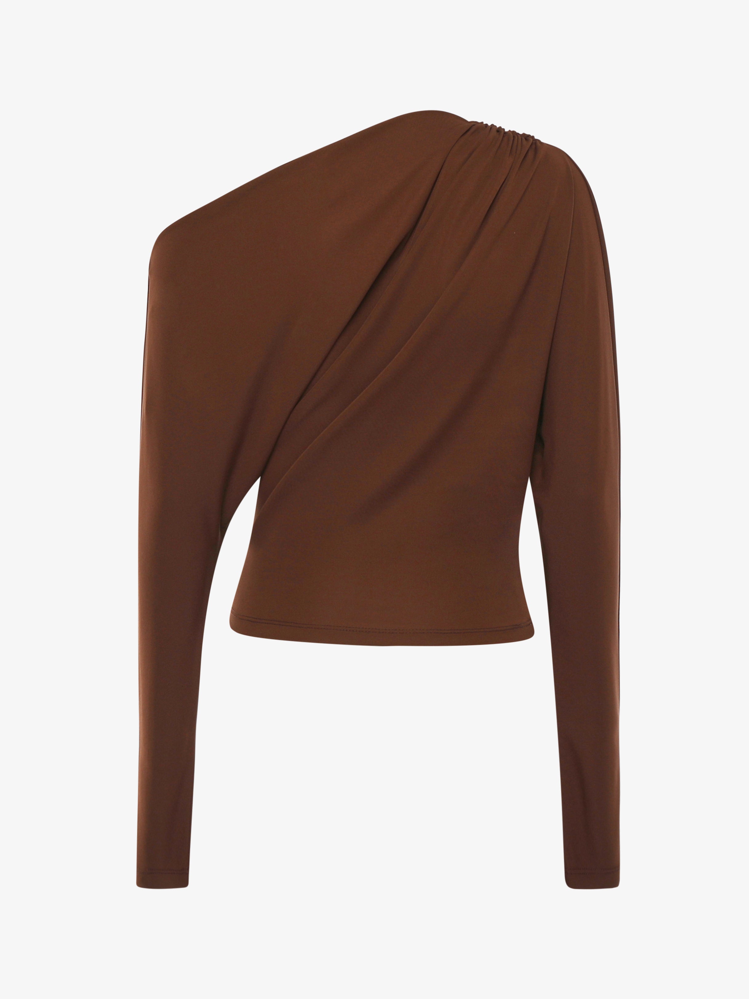 Top in jersey con scollatura asimmetrica, un capo moderno e sofisticato che aggiunge un tocco di originalità a qualsiasi look. Realizzato in tessuto morbido ed elasticizzato, offre una vestibilità aderente che valorizza la silhouette. La scollatura asimmetrica crea un gioco di linee dinamiche e intriganti, lasciando una spalla scoperta per un effetto elegante e contemporaneo.