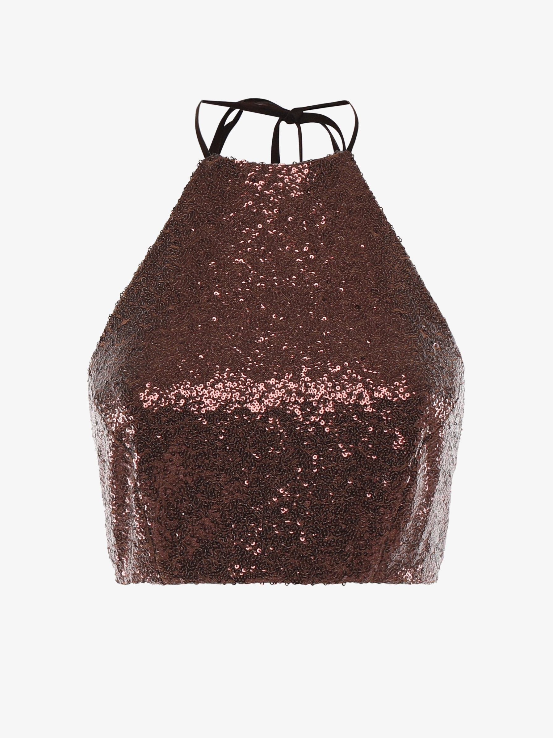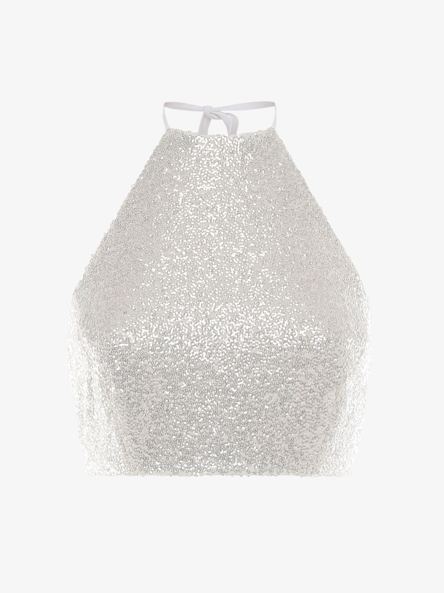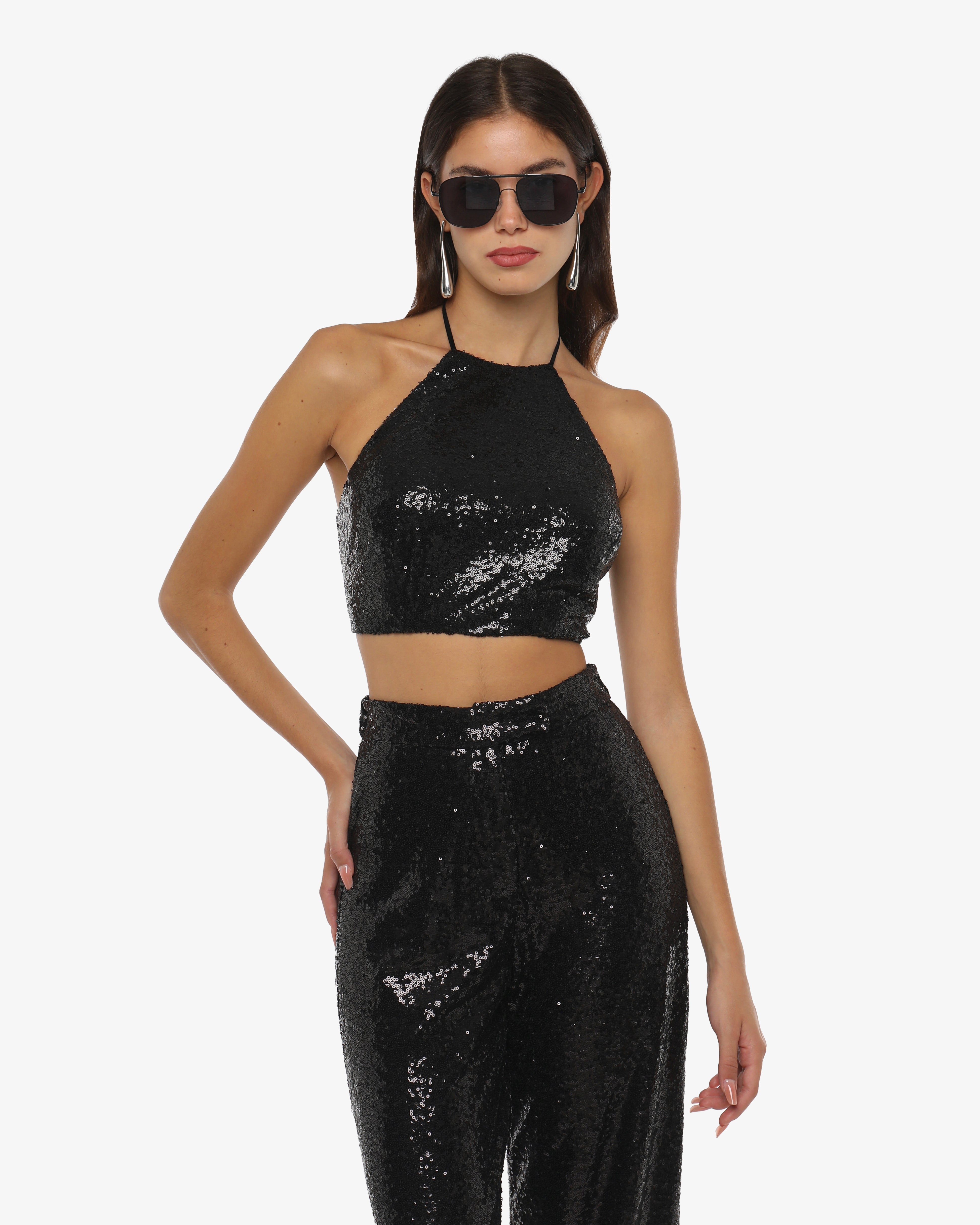 Top cropped con collo all’americana in paillettes, un capo glamour e audace perfetto per serate speciali e look da party. Realizzato con una superficie interamente ricoperta di paillettes scintillanti, cattura la luce a ogni movimento. Il collo all’americana valorizza le spalle e il décolleté, creando un effetto sensuale e sofisticato. La lunghezza cropped lascia scoperta la vita, ideale da abbinare a gonne a vita alta, pantaloni palazzo o shorts eleganti. Completa il look con sandali con tacco e accessori minimal per un outfit da vera protagonista.