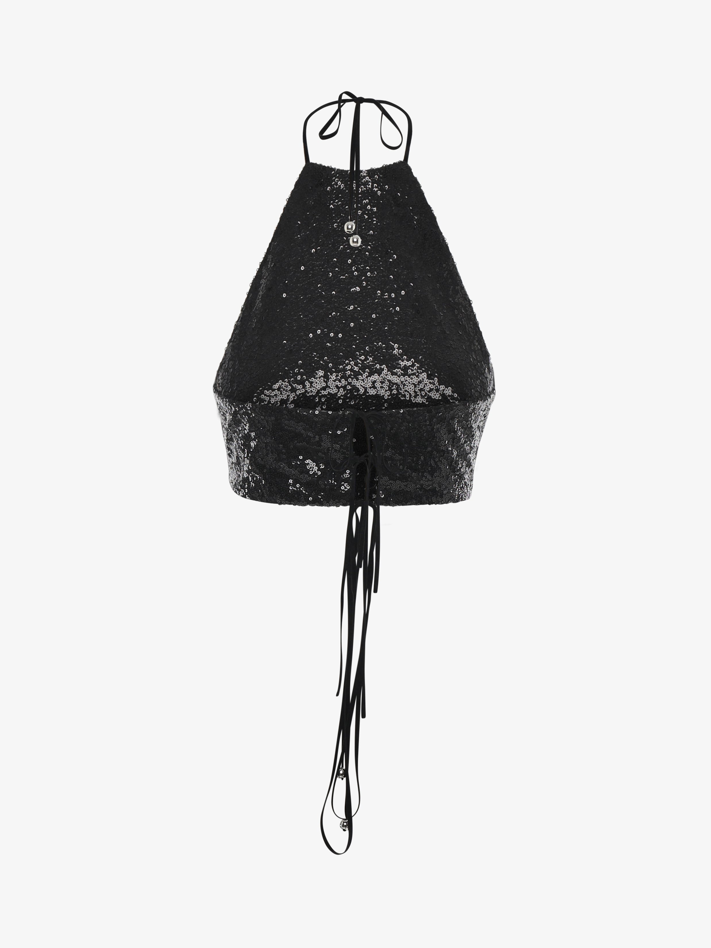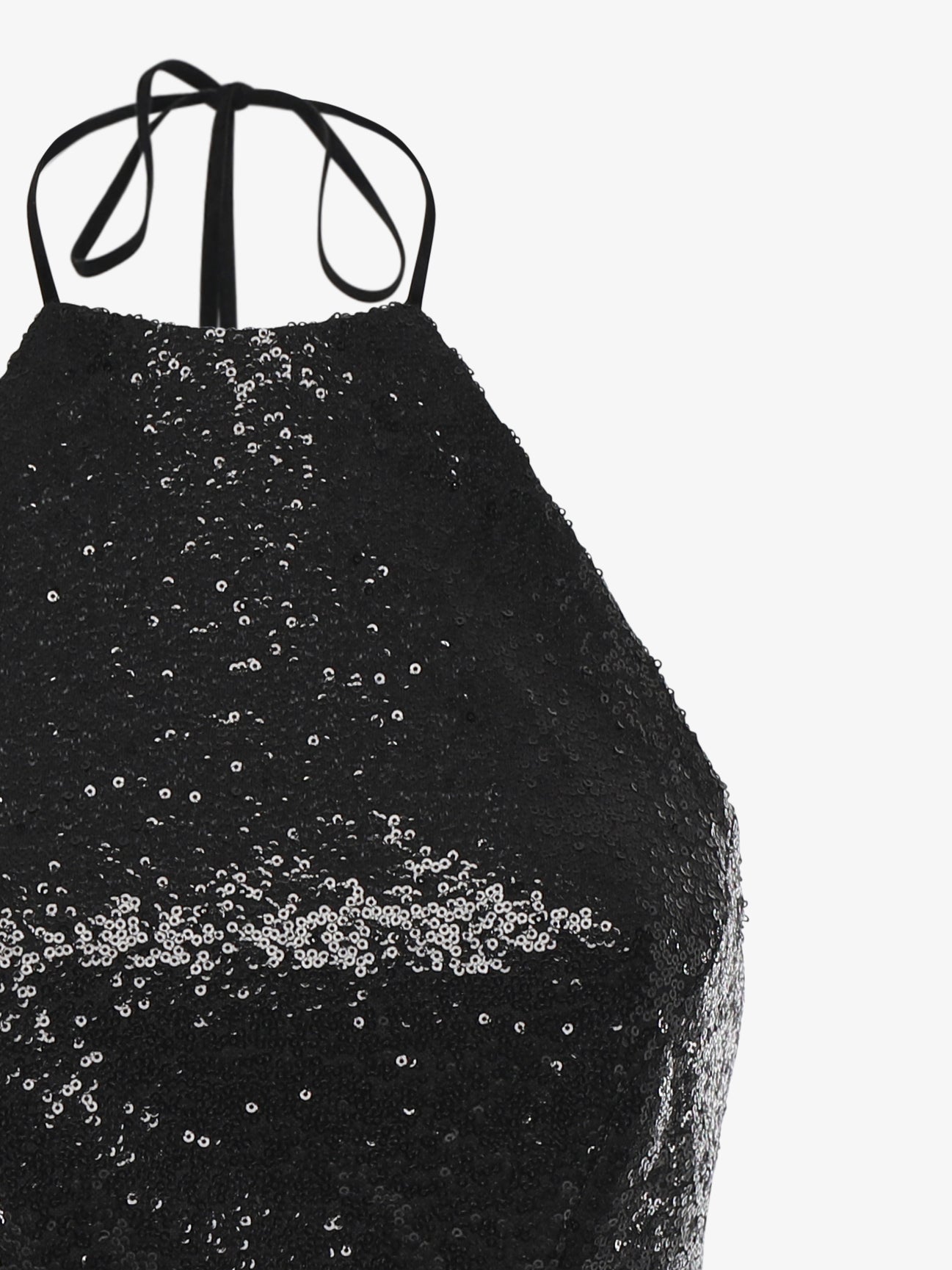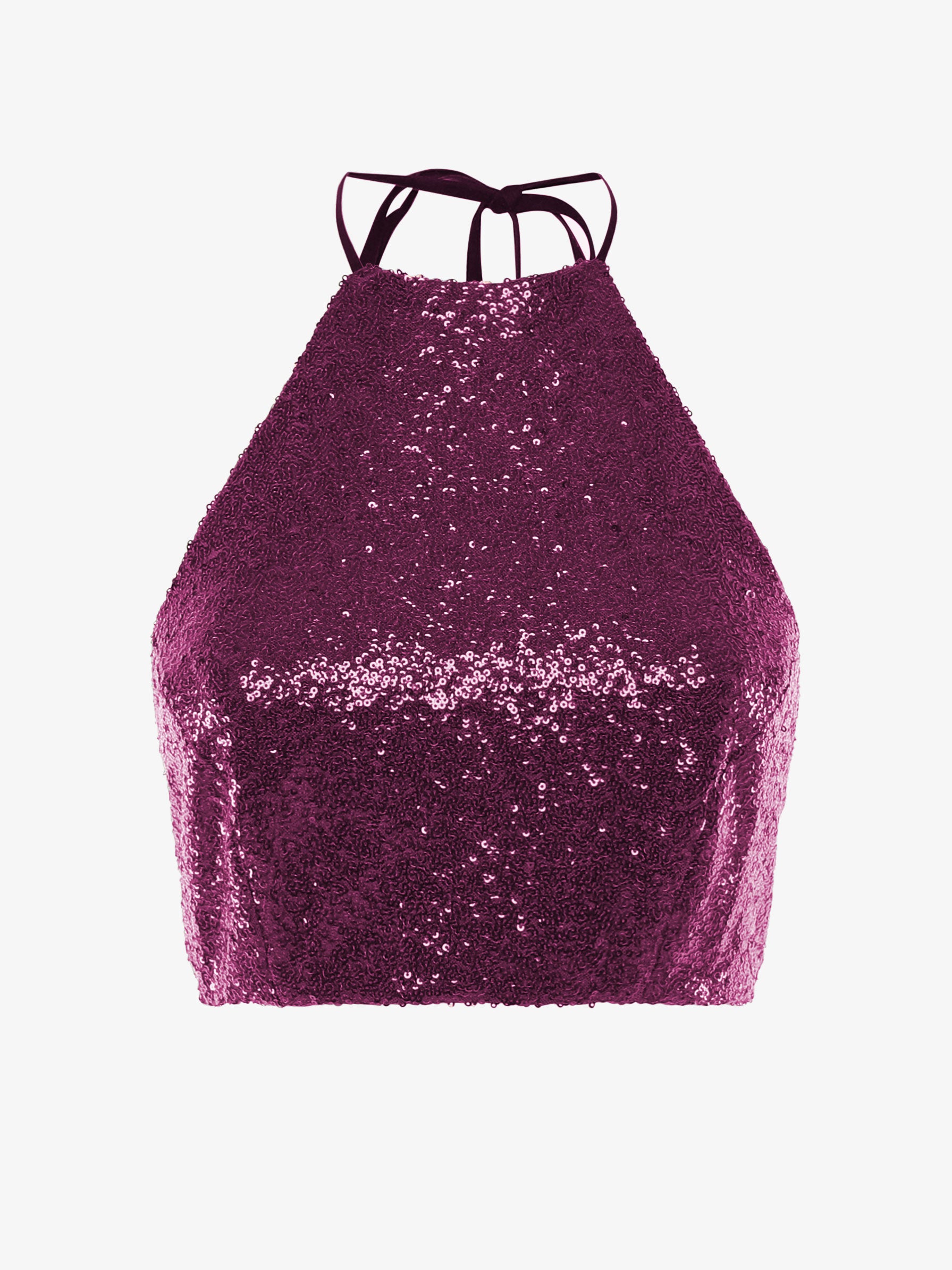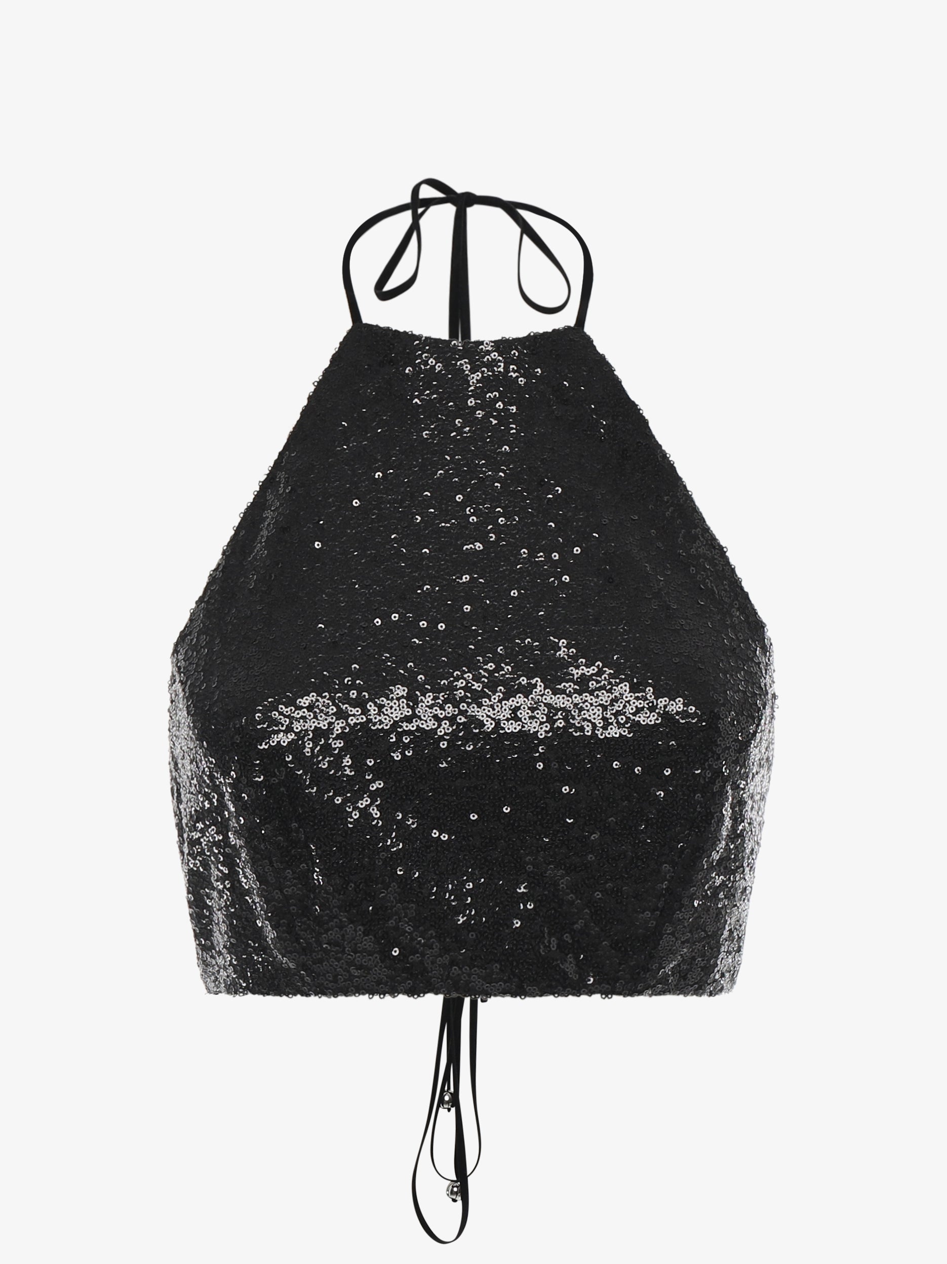 Top cropped con collo all’americana in paillettes, un capo glamour e audace perfetto per serate speciali e look da party. Realizzato con una superficie interamente ricoperta di paillettes scintillanti, cattura la luce a ogni movimento. Il collo all’americana valorizza le spalle e il décolleté, creando un effetto sensuale e sofisticato. La lunghezza cropped lascia scoperta la vita, ideale da abbinare a gonne a vita alta, pantaloni palazzo o shorts eleganti. Completa il look con sandali con tacco e accessori minimal per un outfit da vera protagonista.